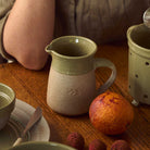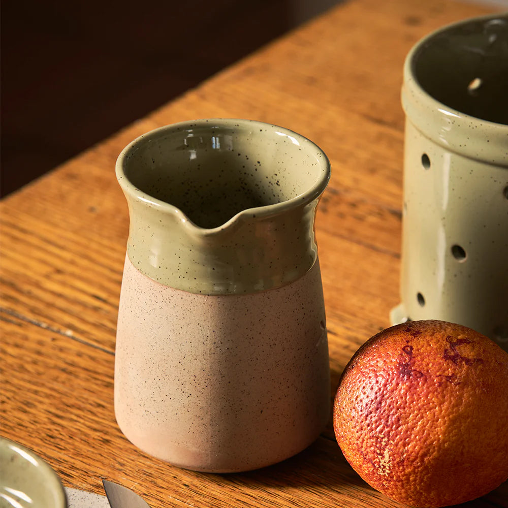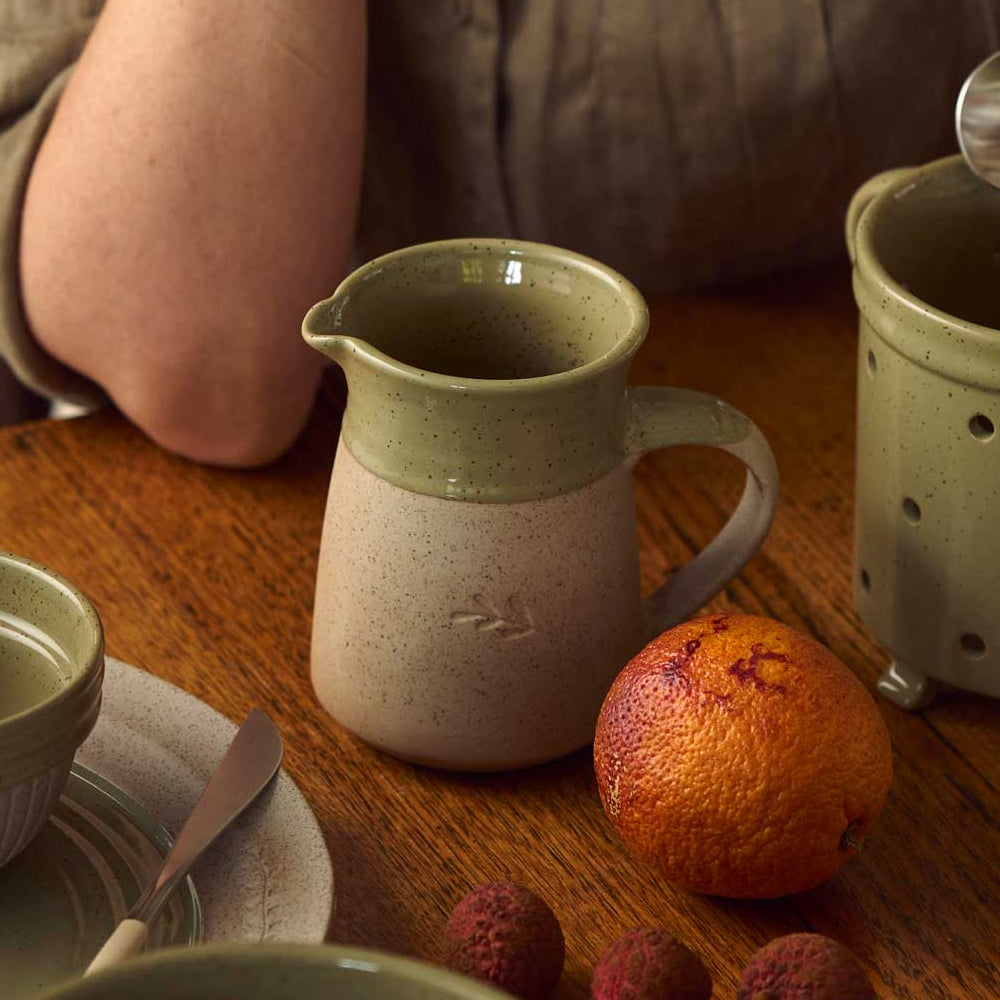 A sweet new addition to your Robert Gordon collection, the Kitchen Life Jug features a combination peppercorn green gloss glaze paired with a raw finish, and gentle leaf embellishment. The perfect practical serving size for milk or gravy.