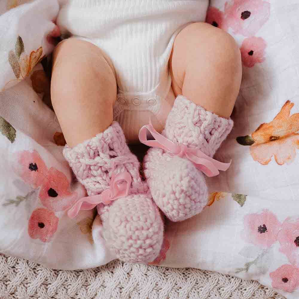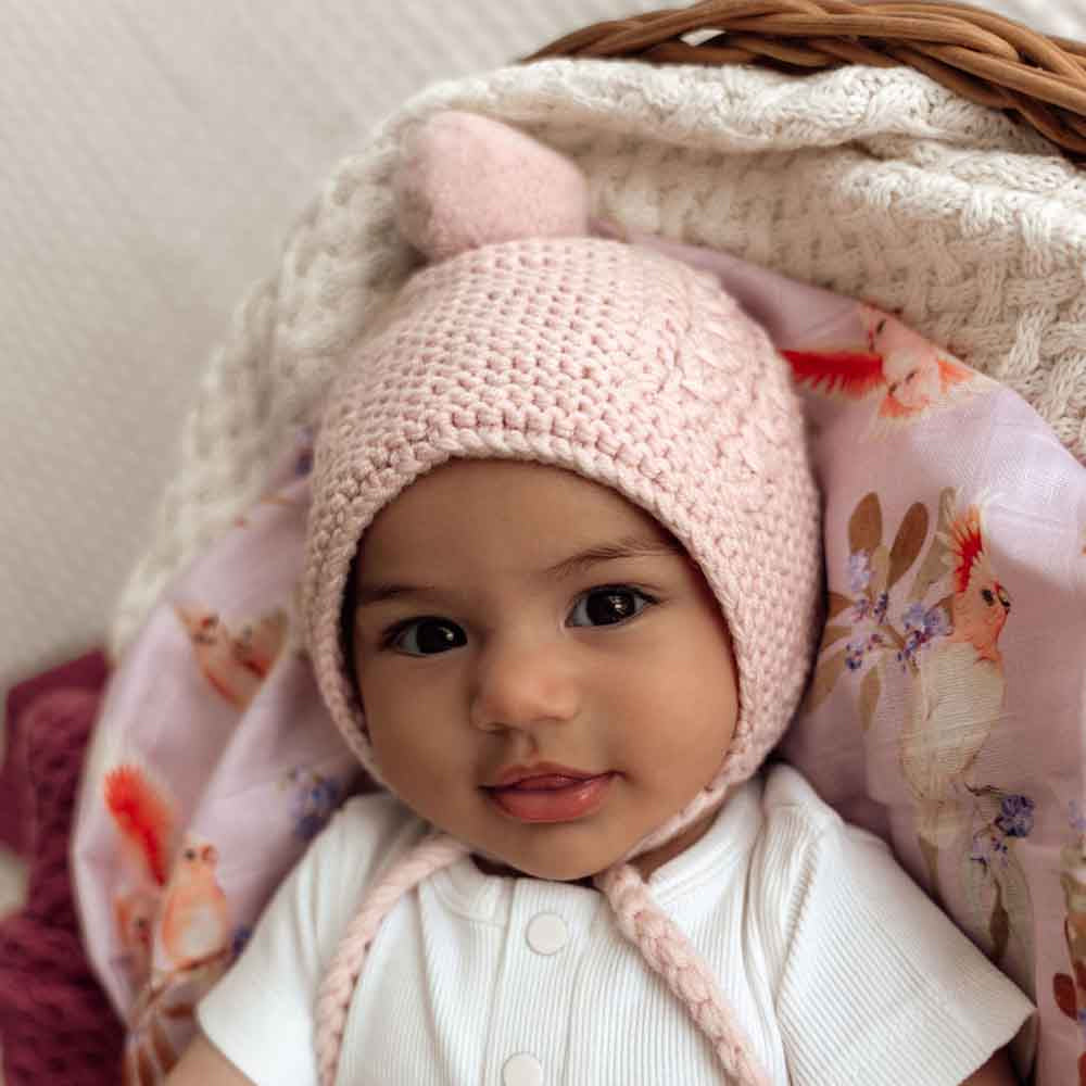 Fall in love with our handmade soft and snuggly Merino Wool Bonnet + Bootie Set. In a beautiful pale pink, this set pairs back perfectly with a number of baby wraps in the Snuugle Hunny collection. The perfect newborn gift set for a new baby or expecting parent.