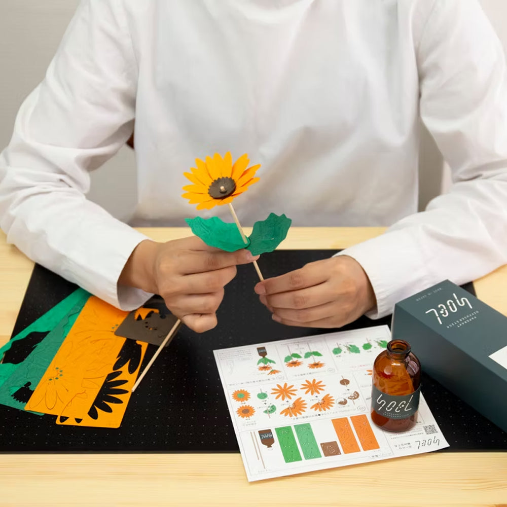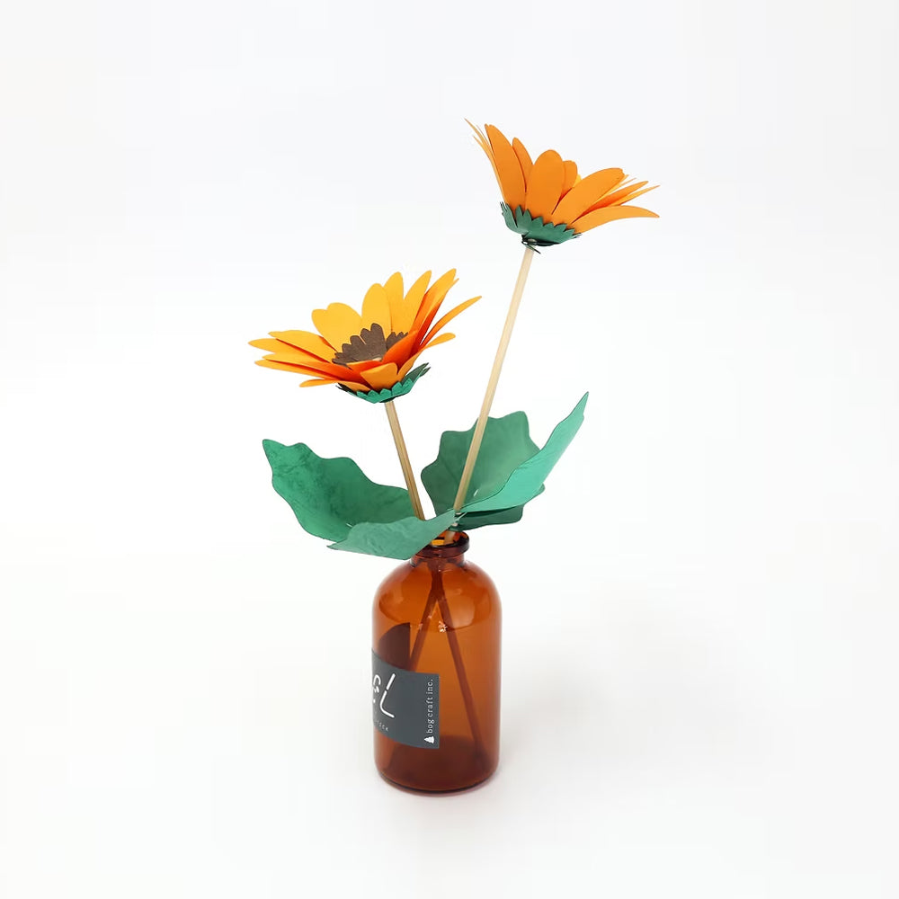 An exercise in mindfulness, the pre-cut paper Gerberas assemble and attach to sticks, which you place inside the small glass bottle to resemble a diffuser. The sticks, whilst decorated, still work as reed sticks! Just add your own fragrance oil (not included) and use as a functioning room diffuser. Or simply enjoy the work of paperart you've created.