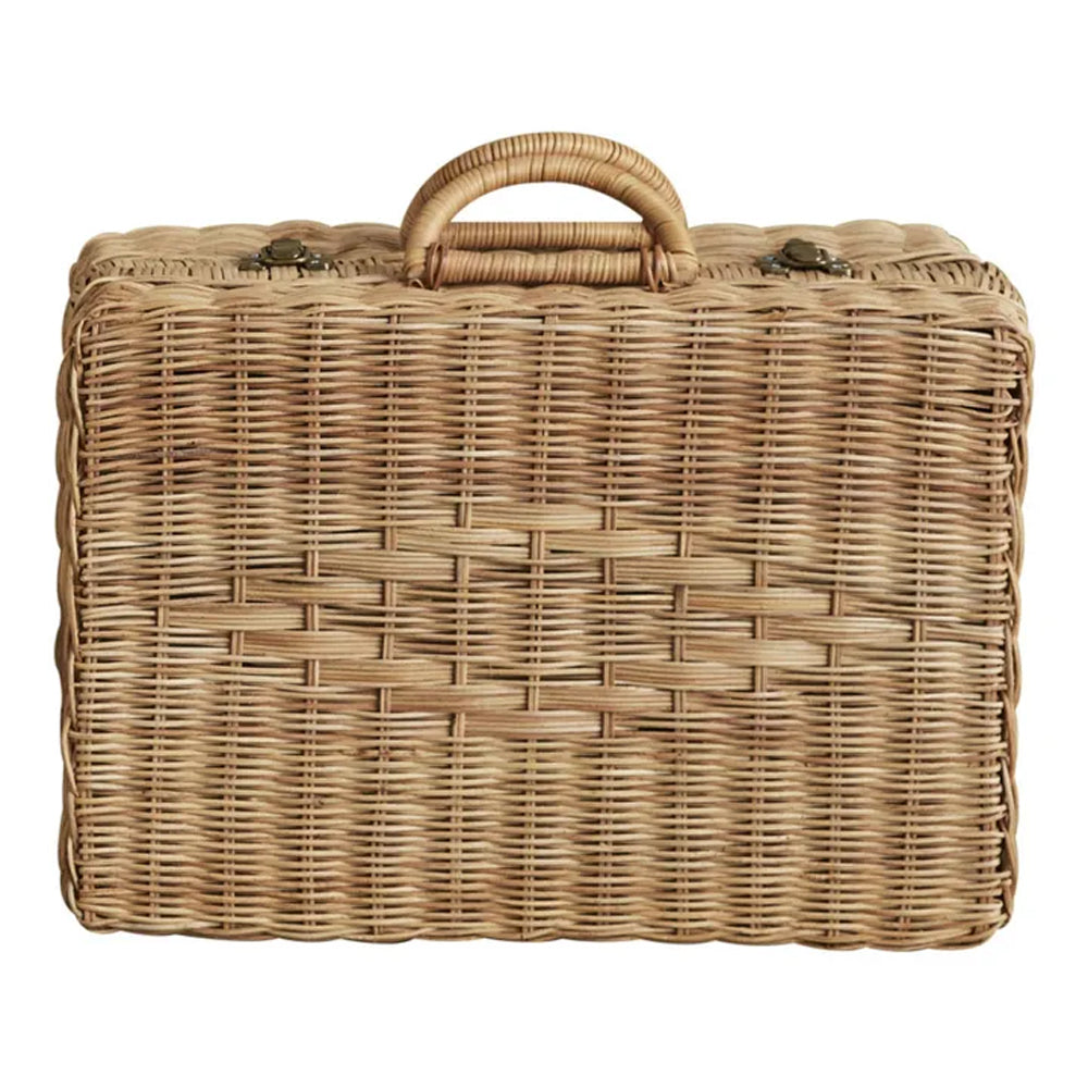 Featuring hand-woven natural rattan with metal hinges and latches.