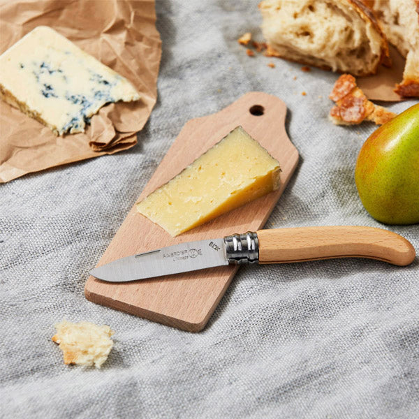 Constructed from stainless steel and beech wood, the blade folds inward for safe transport and storage, and locks into place when opened.