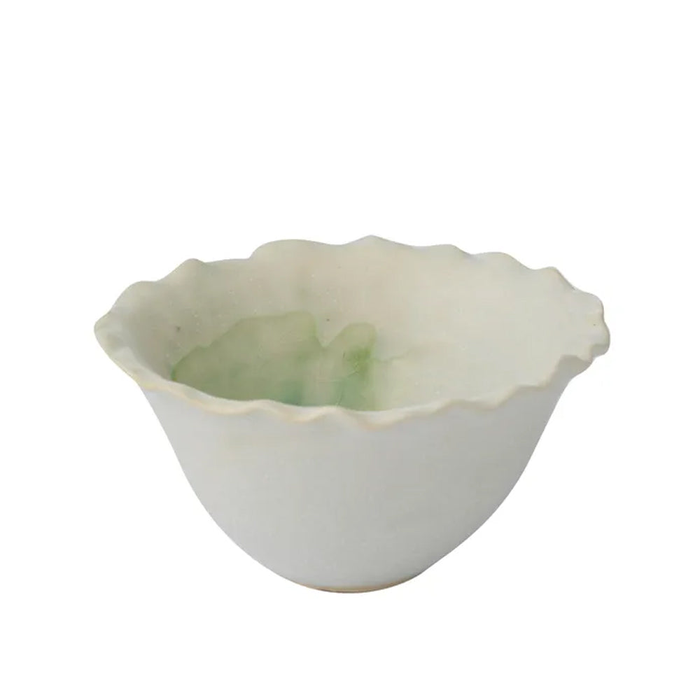 The ceramic Vert Bowl features a delicate, gently ruffled rim and tapered silhouette, with watercolour-like splashes of green on the inside.