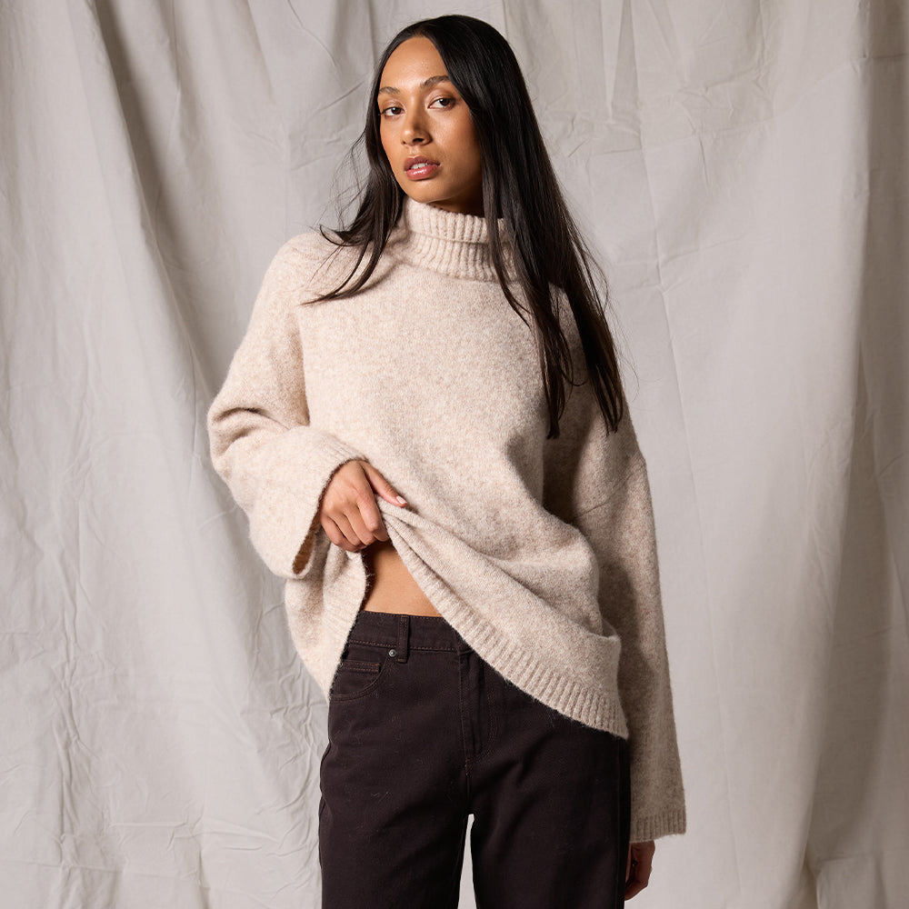 Meet the Willow Knit Jumper (Silent Theory Clothing) your new trans-seaonal go to knit. Made from a soft wool blend yarn, this jumper features a relaxed fit with roll neck and wide sleeves. Pair back with your favourite pants or skirt with boots for a relaxed but dressy look.