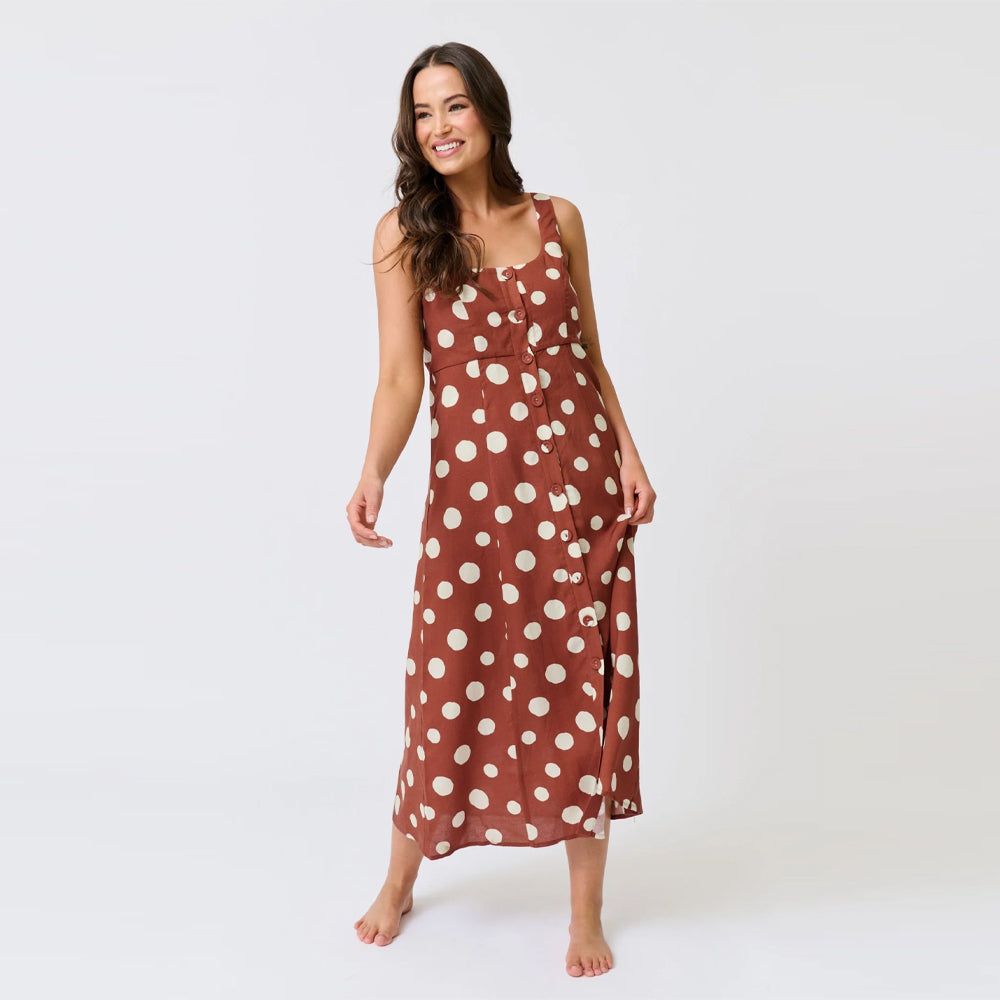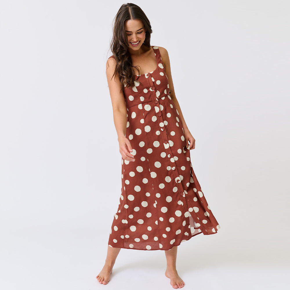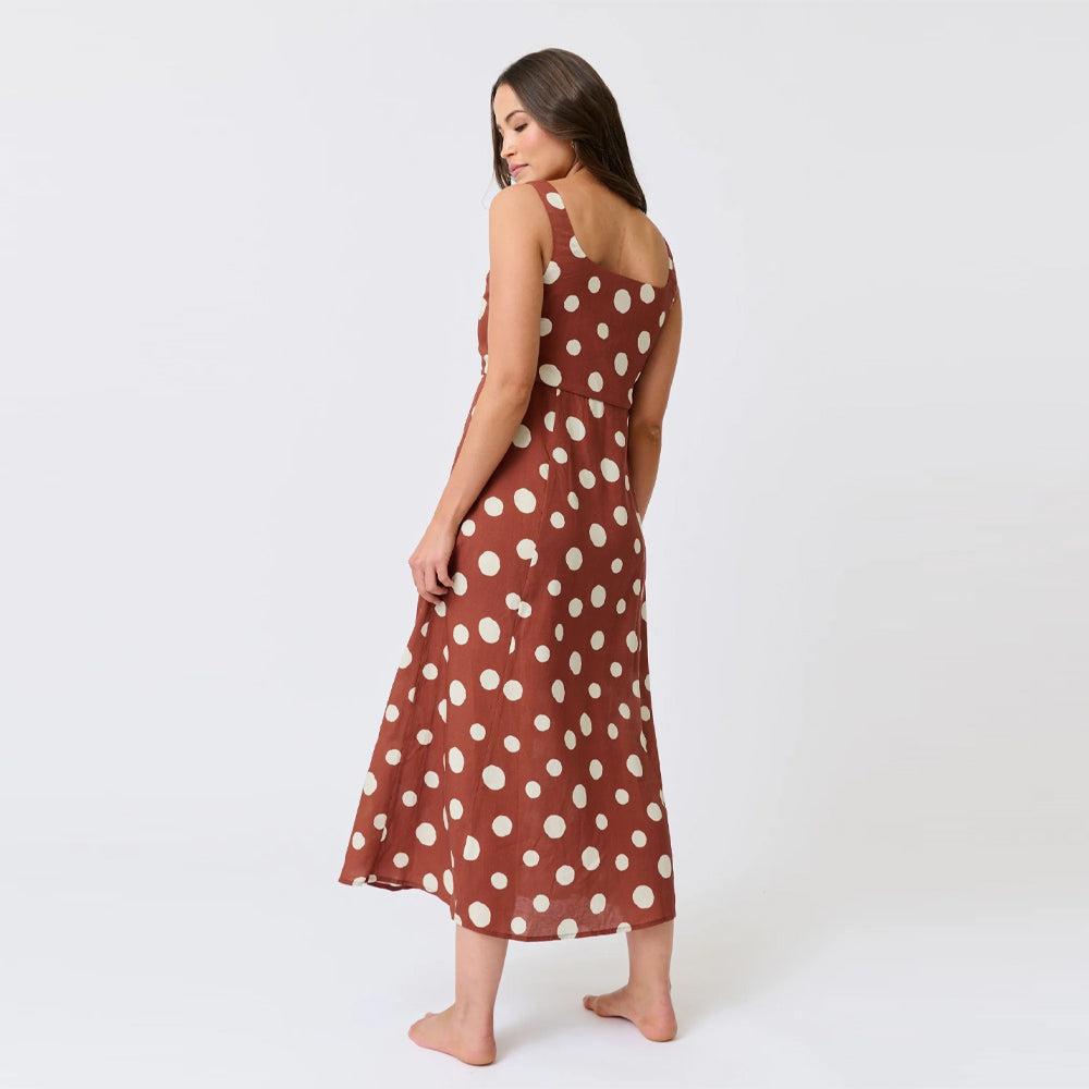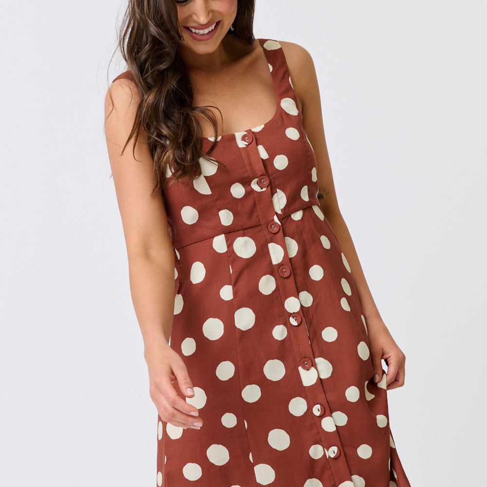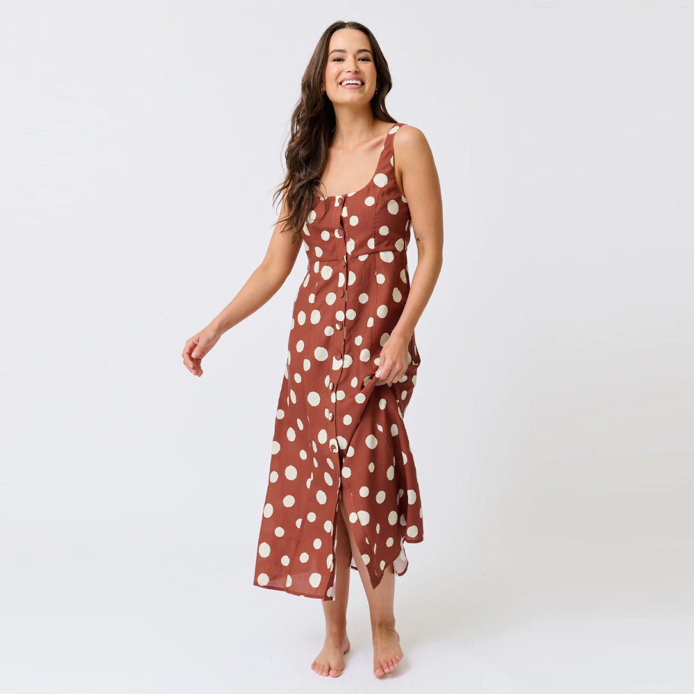 The Constance Midi Dress (Cartel + Willow) will be a fun new addition to your Spring + Summer wardrobe. The 100% linen fabric in a rust spot print makes for an effortlessly stylish look with slides.