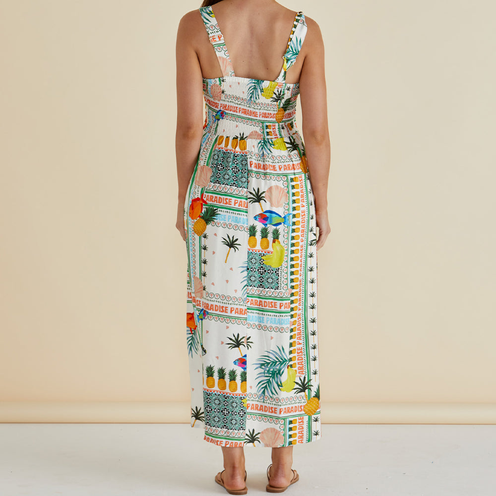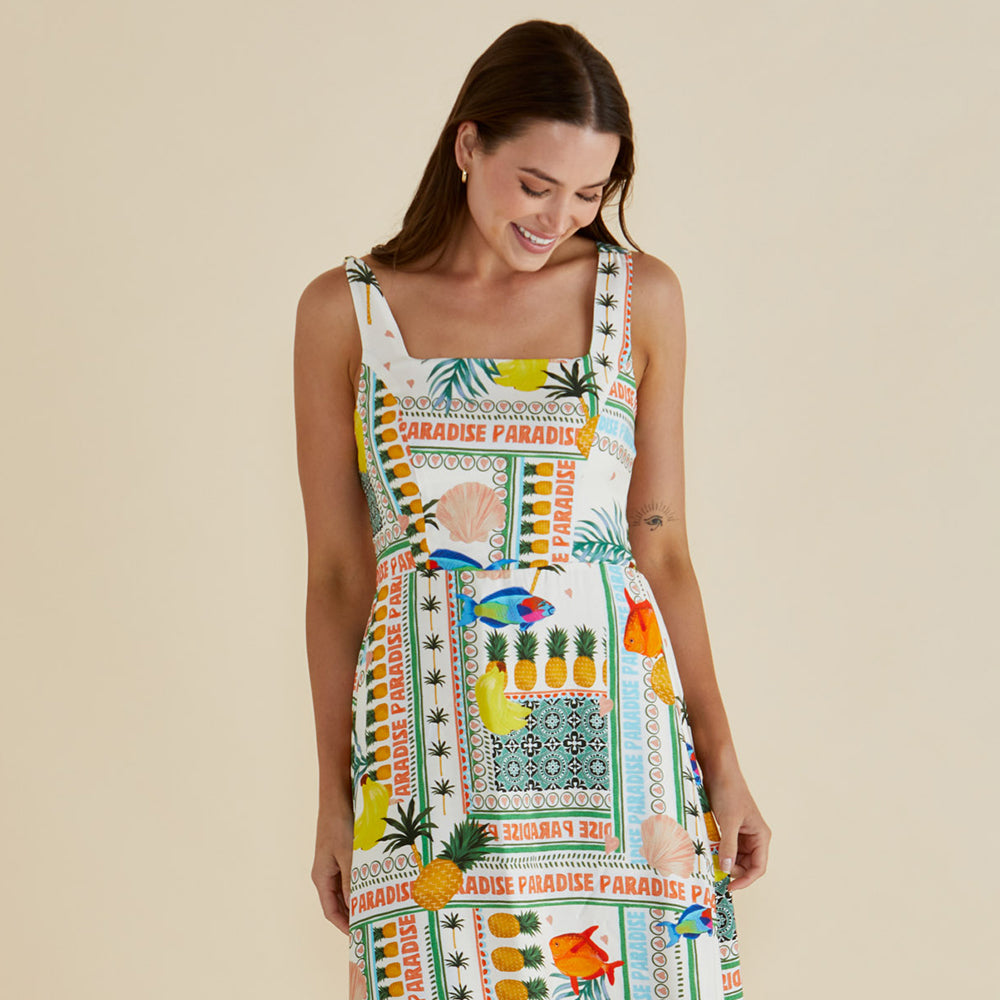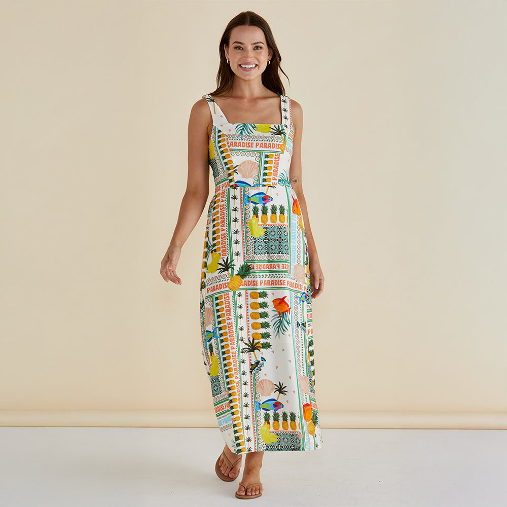 The Tegan Midi Dress (Betty Basics) offers a flattering fitted silhouette with a square neckline and shirred back panel for comfort. Crafted from a soft viscose blend, it features side splits and a midi length for elevated style. A classic, effortless dress designed for transeasonal elegance.