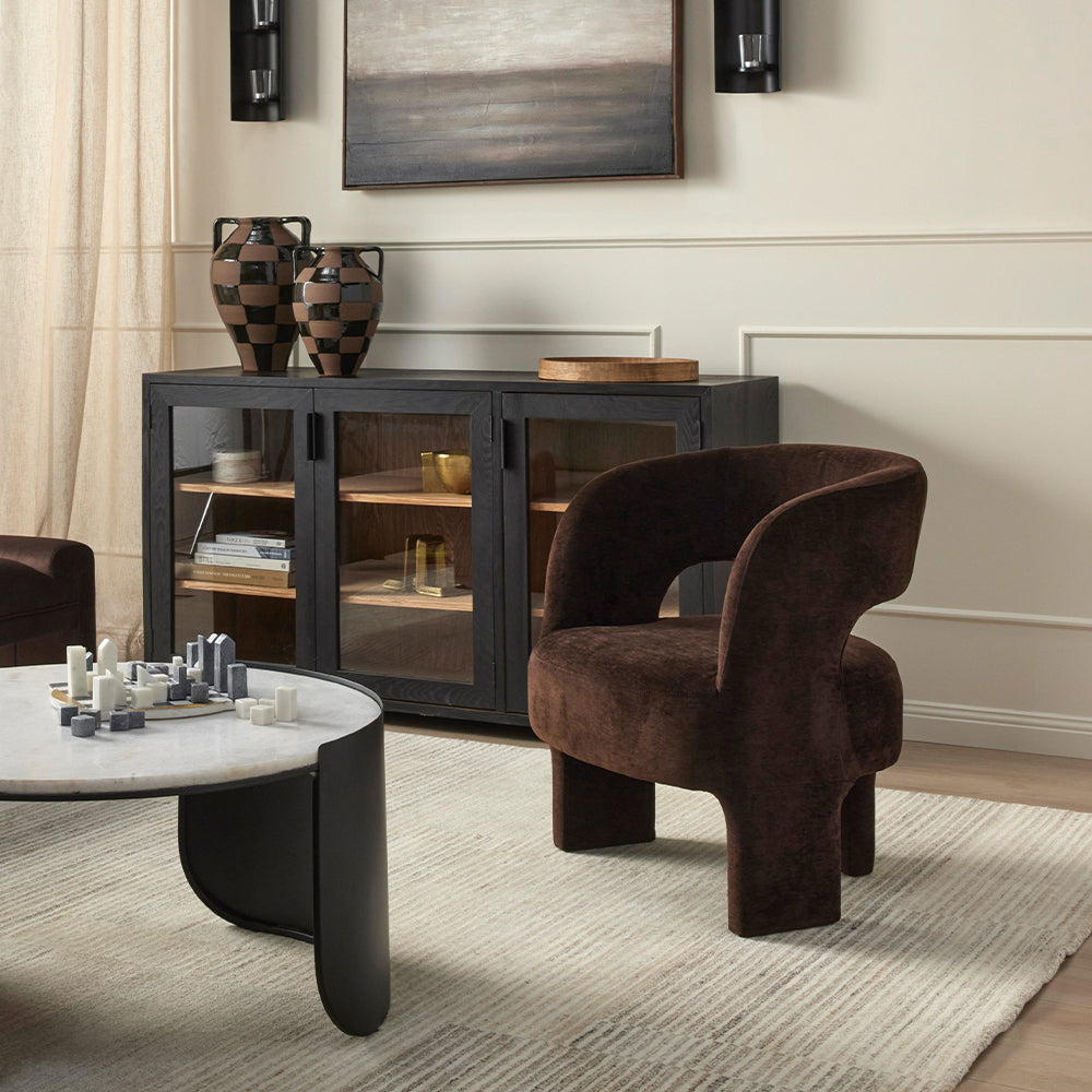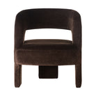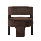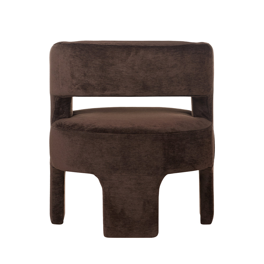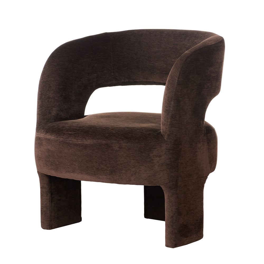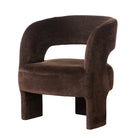 In a rich chocolate brown, the luxe Formes Armchair is stylish and comfortable. Featuring a curved open back, three legs and plush velvet finish, its sculptural silhouette is the perfect contemporary update to your space.