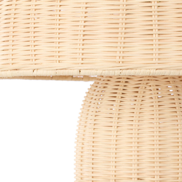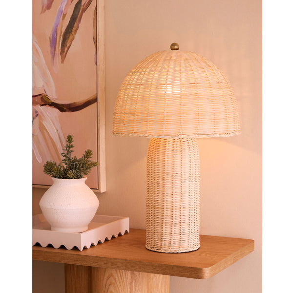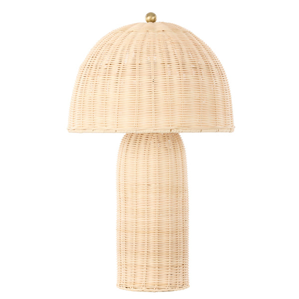 It features a hemispherical rattan shade, topped with brass detailing, on a matching cylindrical rattan base in natural hues. The perfect piece to introduce texture to your space.