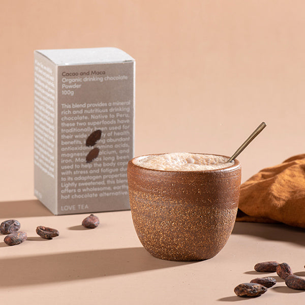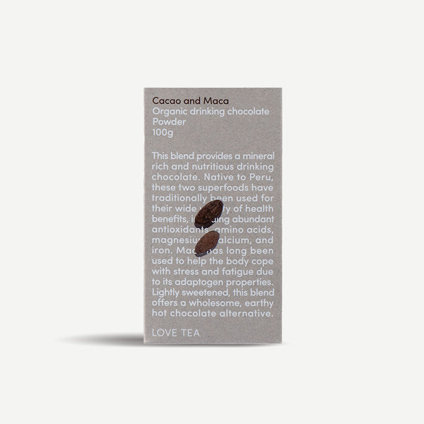 This Cacao and Maca blend provides a nutritious and mineral rich drinking chocolate. Native to Peru, these two superfoods have traditionally been used for their wide variety of health benefits and abundant antioxidants, amino acids, magnesium, calcium, and iron. Maca has long been used for its adaptogen properties, helping the body cope with stress and fatigue. Lightly sweetened with coconut nectar, this blend offers a wholesome and earthy hot chocolate alternative.