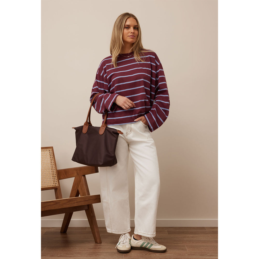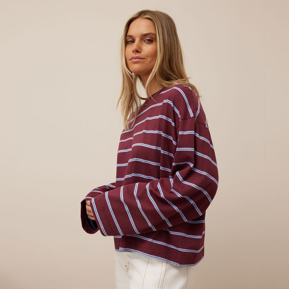 Beau Long Sleeve Slouchy Tee - Washed Burgundy + Sky Blue