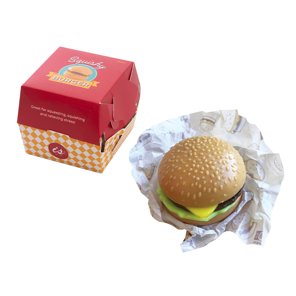 5 layers of squishy fun with cheese, lettuce and a patty between a bun. Each burger comes wrapped in paper and packed in a cardboard box, just like a real burger! Except please don't eat this one.