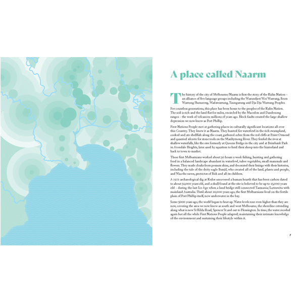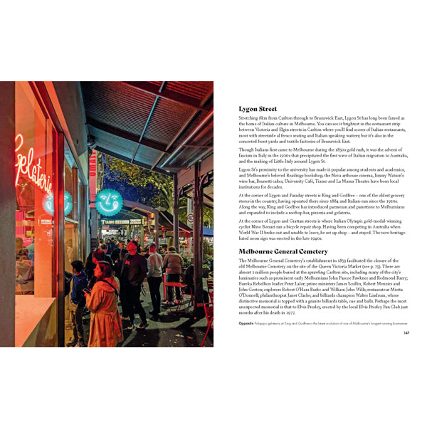 This book is filled with fascinating stories and histories that unearth the quirky character of the city and its neighbourhoods, from tales of Wurundjeri and Bunurong Traditional Owners, to surveyor Robert Hoddle's original street plan, to South Melbourne dimmies. It's these stories that not only showcase Melbourne's variety of people, scenes and cultures, but also uncover the threads that connect Melbourne to the rest of the country and the world.