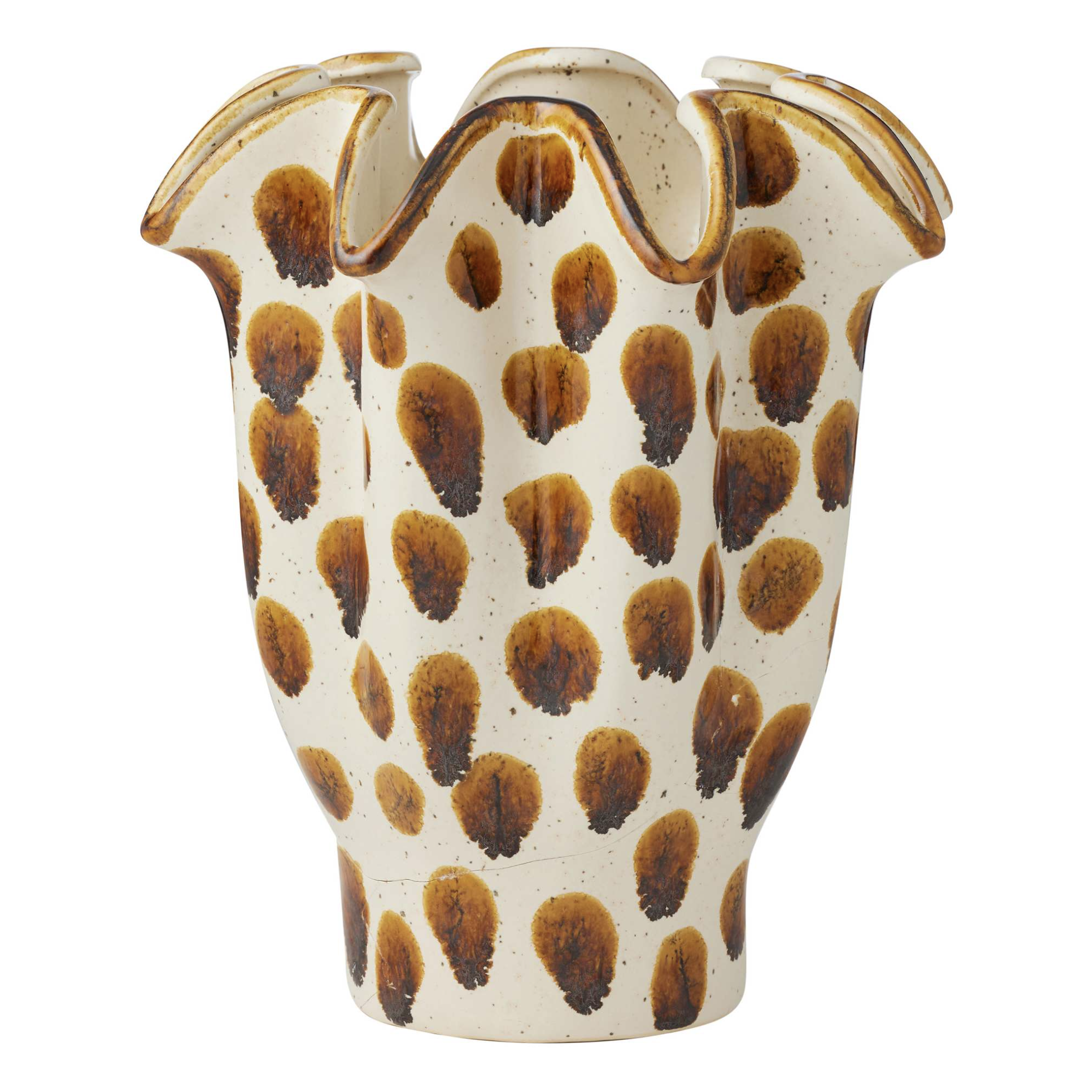 Playfully over-the-top, the Brun Ceramic Vase is dramatic and different. Featuring painterly brown spots on a speckled ivory base, a gathered silhouette and exaggerated pleated rim with brown trim.