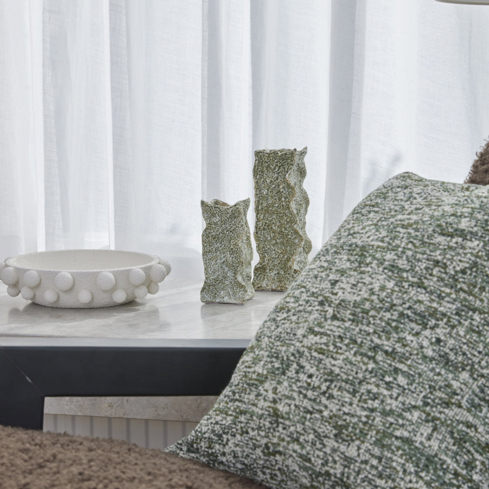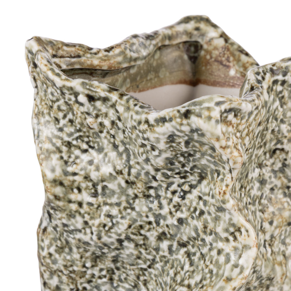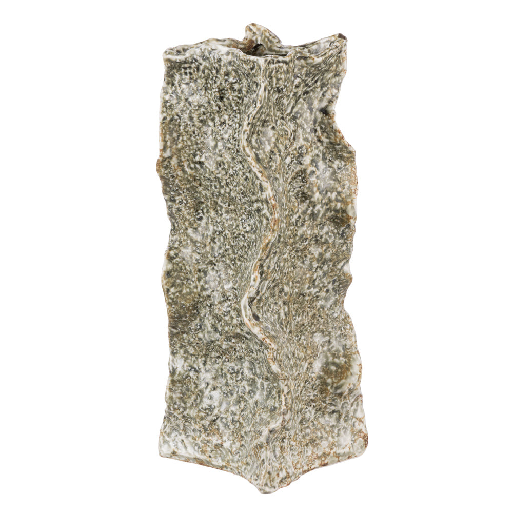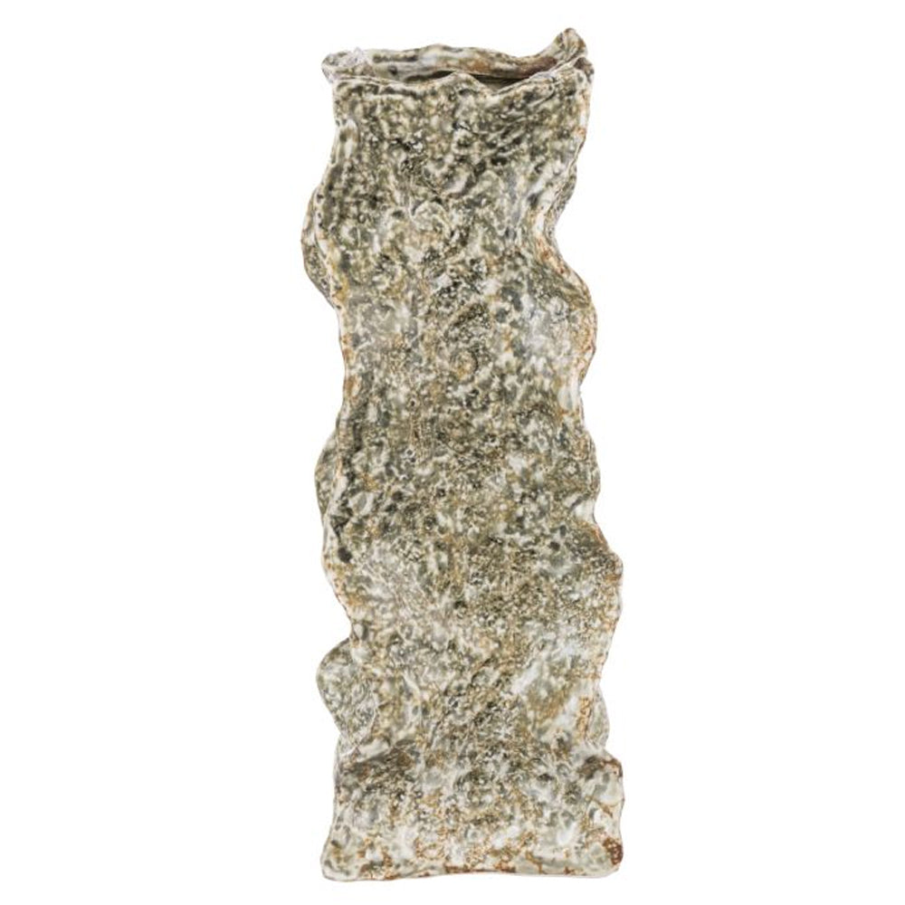 Its reactive green glaze adds to the textured appearance, showcasing mottled earthy tones replicating stone.