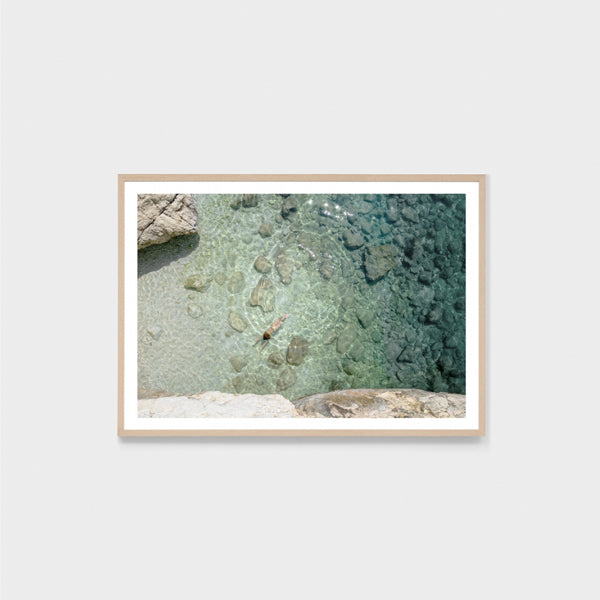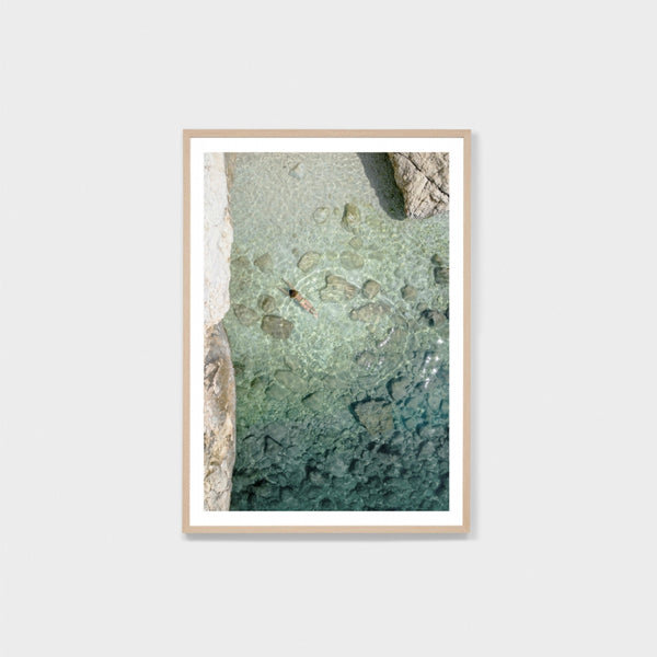 Add a dreamy, tranquil touch to your home with this stunning aerial photographic print, featuring a swimmer enjoying crystal clear waters.