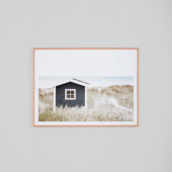 Make a statement in any space with this mordern coastal print, featuring a sweet little cottage on the coast of Sweden.