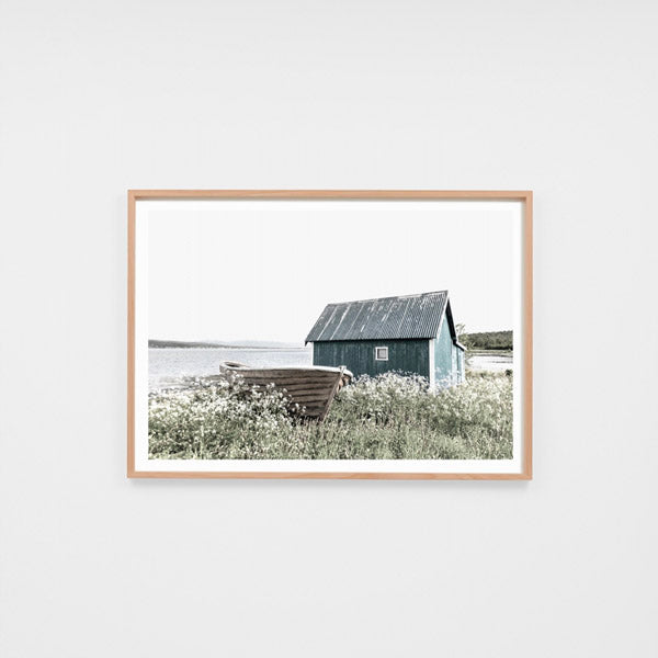 Add character and interest to your space with this photographic print featuring a rustic boathouse in Norway.