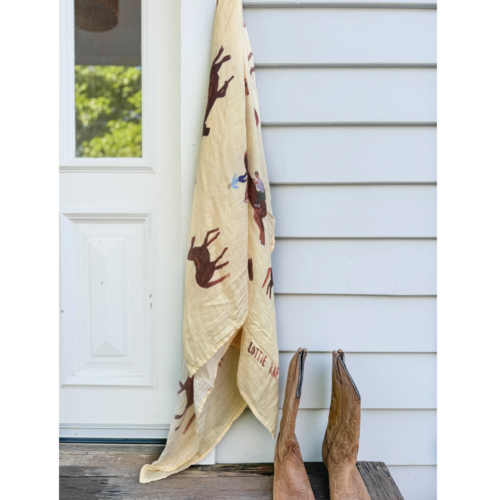 The All The Kings Horses Wrap features Lottie's signature rodeo cowboys and bucking horses on a buttery background.