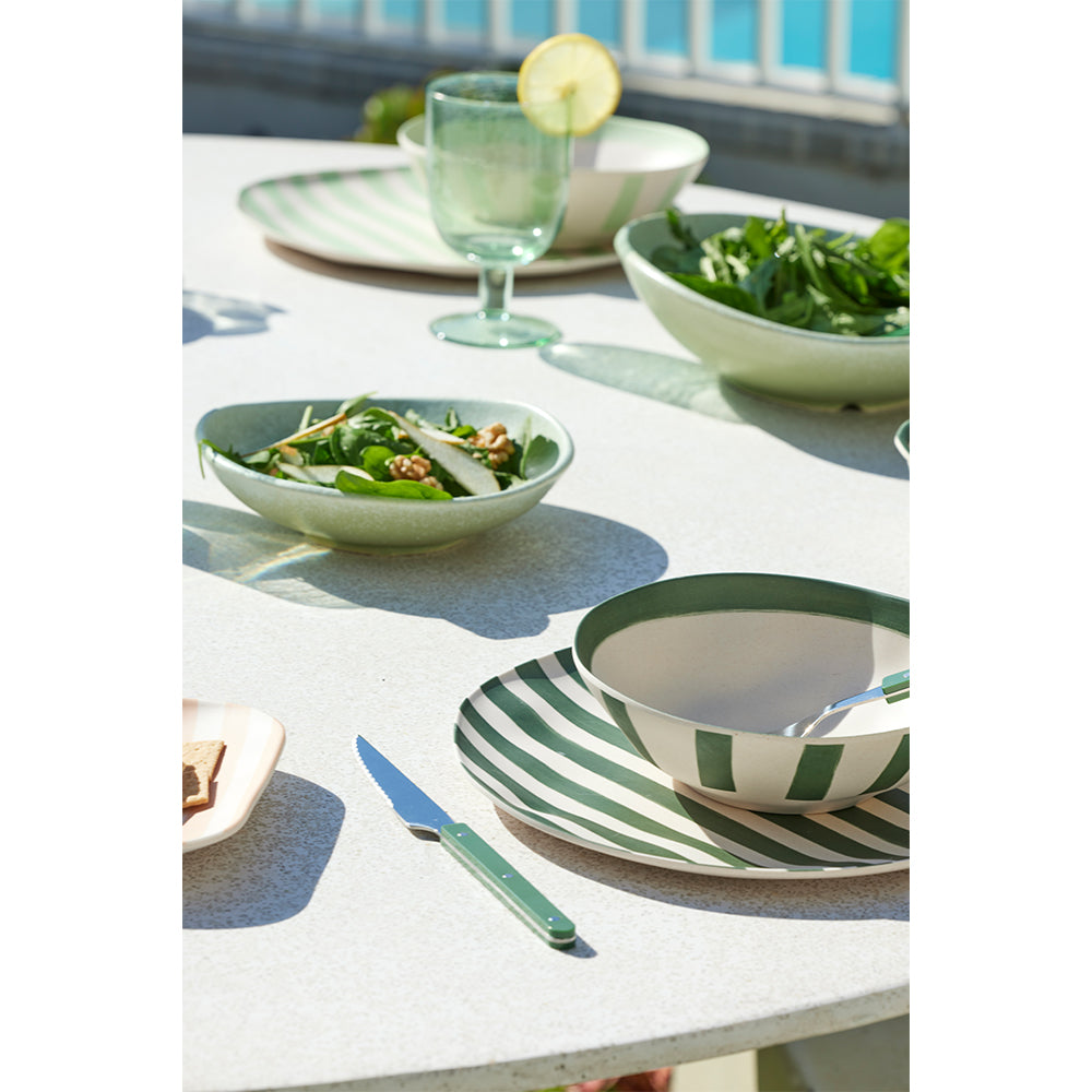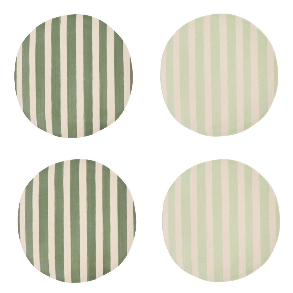 Elevate your entertaining with the Saltara Plates. This set of 4 dinner plates features a simple stripe design - 2 in olive, 2 in mint - with a gently dimpled surface and slightly irregular shape. Quality to the touch, they're made with bamboo fibre, a sustainable material that is strong and durable, whilst being kinder to the planet too.