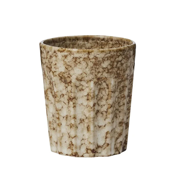 The Studio Latte Cup is a classic ceramic tumbler style featuring a marble-like Cocoa glaze with unique markings. Perfect for hot or cold beverages.