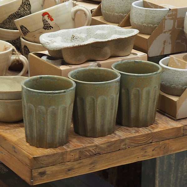 The Studio Latte Cup is a classic ceramic tumbler style featuring a striking earthy Olive glaze with unique markings. Perfect for hot or cold beverages.