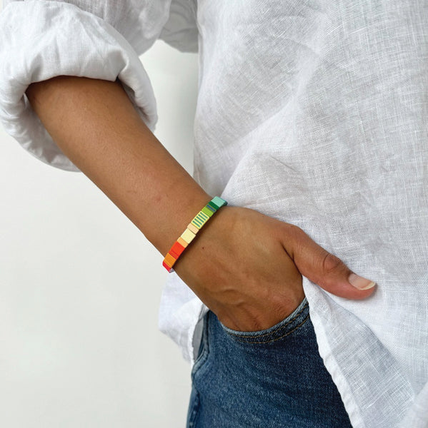 Elasticated for easy wear, you can stack it with other fun colourways in the Tile Bracelet range, pair it back with gold chains or bangles, or let it be your go-to solo statement piece.
