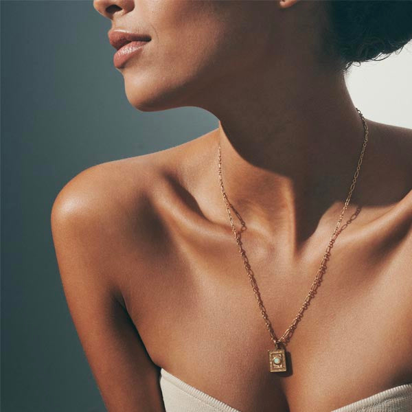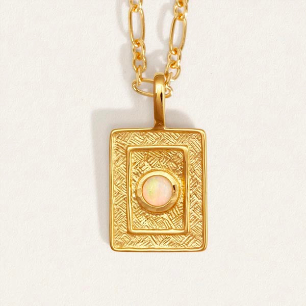 The Agora Necklace is an opal necklace set into a textural pendant of 18k gold vermeil with a figaro chain. In Classical Greece, the agora served as the social, spiritual, political, and academic heart of the city. An open space for citizens to mingle and ideas to form. The birthplace of democracy itself.