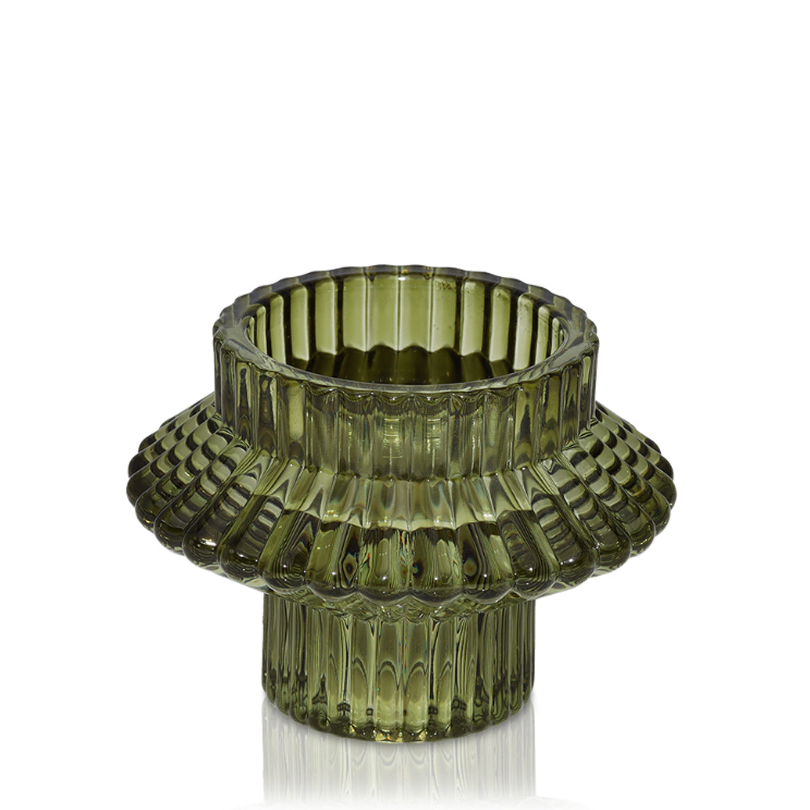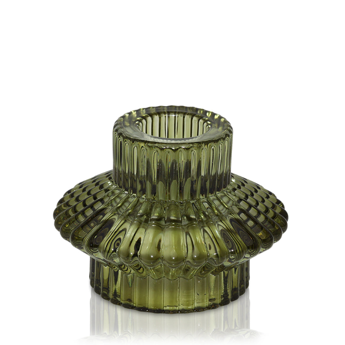 The Aida Vintage Glass Candle Holder in Moss has a striking, retro silhouette and elegant pleated glass finish. Cleverly designed to suit multiple candle types. Simply flip this duo candle holder over to hold tealight candles or use narrow side up for both Dinner and Taper candles.