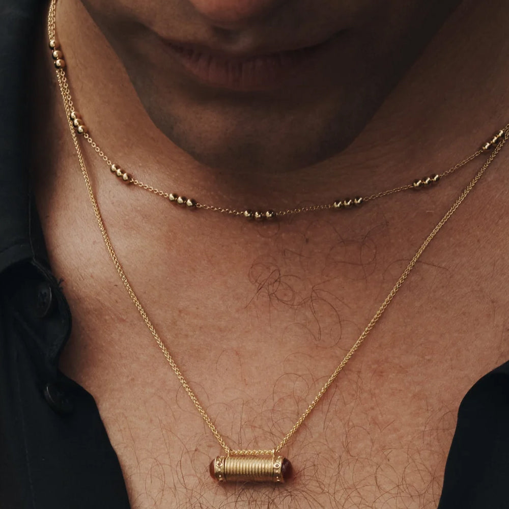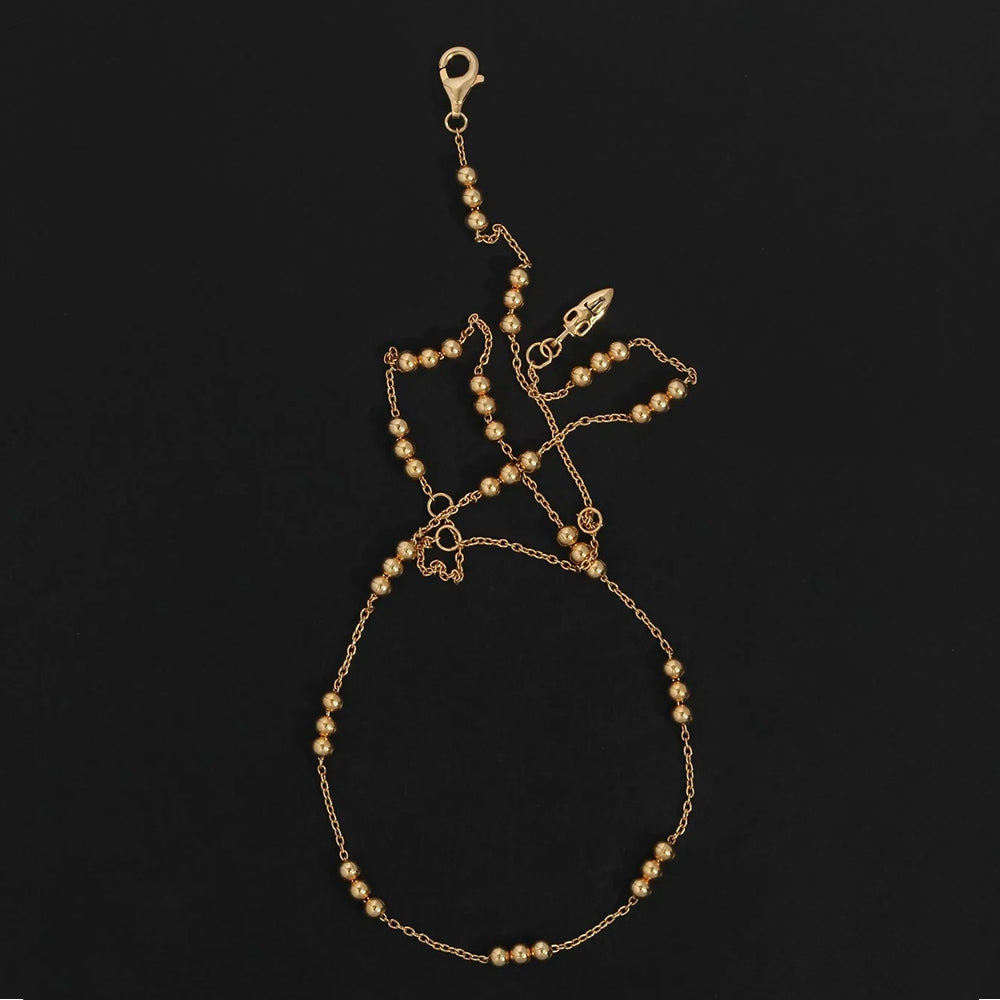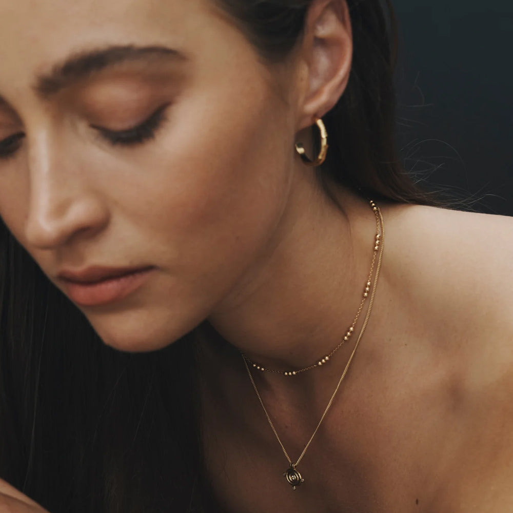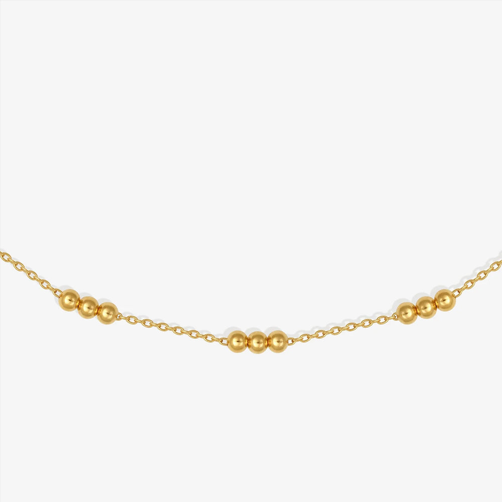 Crafted from 18k gold vermeil, the Alba features a fine cable satellite chain adorned with a trio of polished beads in a rhythmic sequence. Designed as a foundation for layering, this choker also holds its own as a minimalist standalone piece.