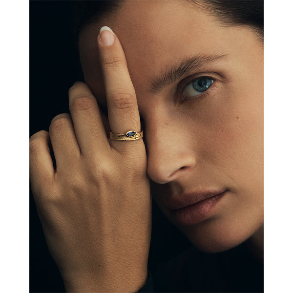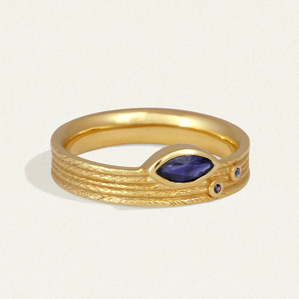 The Alessandra Ring, with its evocative evil eye design, features a marquise-cut iolite accented with a pair of dark blue sapphires.