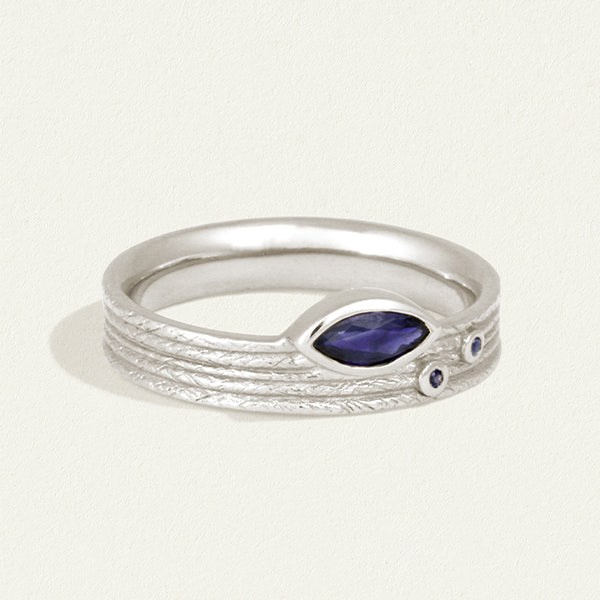 The Alessandra Ring, with its evocative evil eye design, features a marquise-cut iolite accented with a pair of dark blue sapphires.