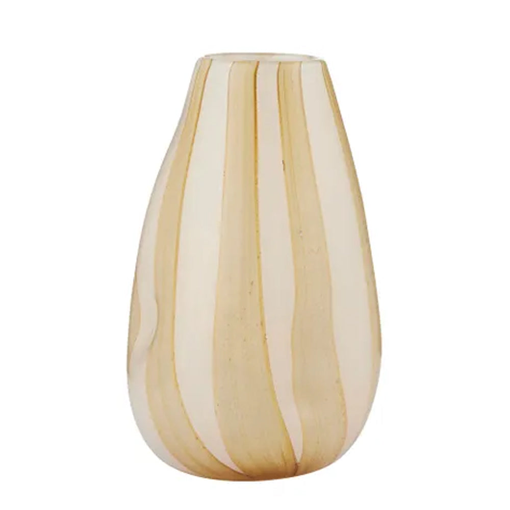 The Alice Glass Vase features stunning painterly strokes in ivory and a soft, buttery mustard, complemented by a gentle dimpled silhouette.