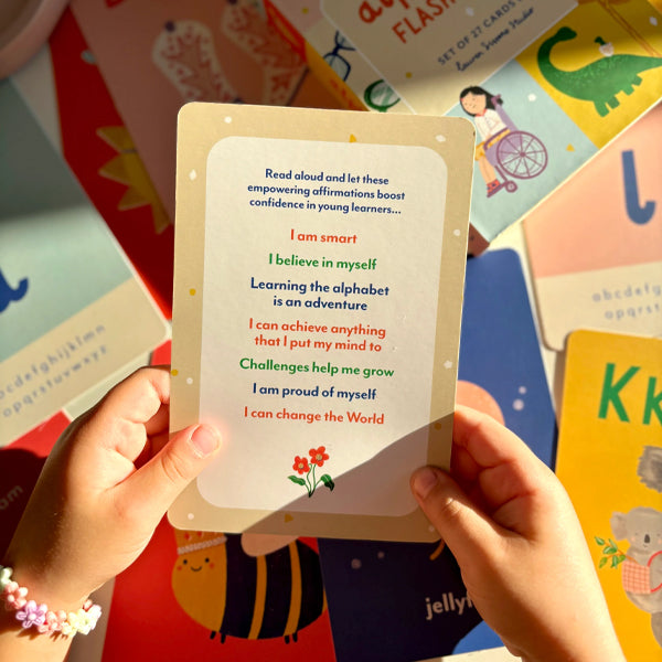 Setting this set apart, inside you'll find an additional card with positive affirmations designed for children to read aloud with a grown up. This interactive feature provides an engaging way to boost their confidence as they embark on their learning journey.
