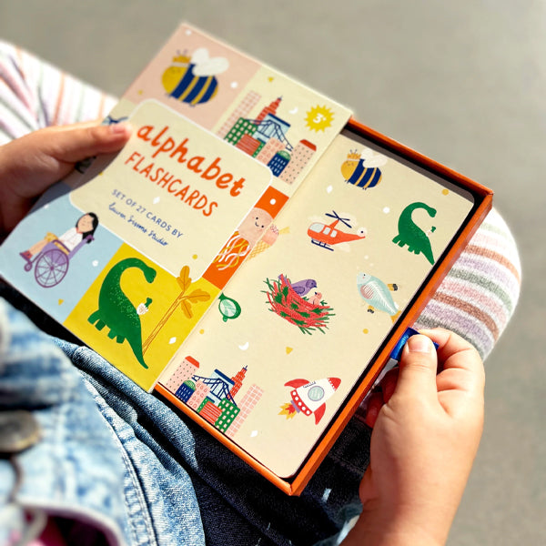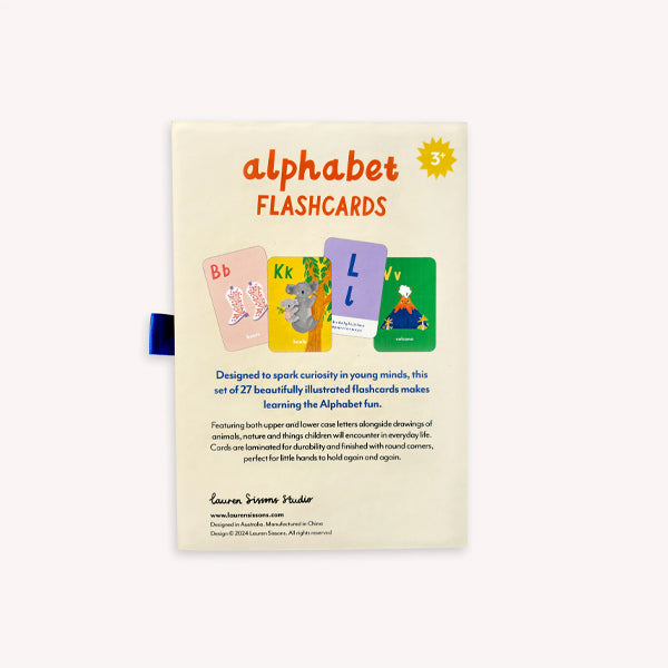 Packaged in a premium, keepsake box that opens to reveal vibrant flashcards that showcase both upper and lower case letters, alongside adorable drawings of animals, nature and things children will encounter in everyday life. Cards are laminated for durability and finished with rounded corners, perfect for little hands to hold again and again.