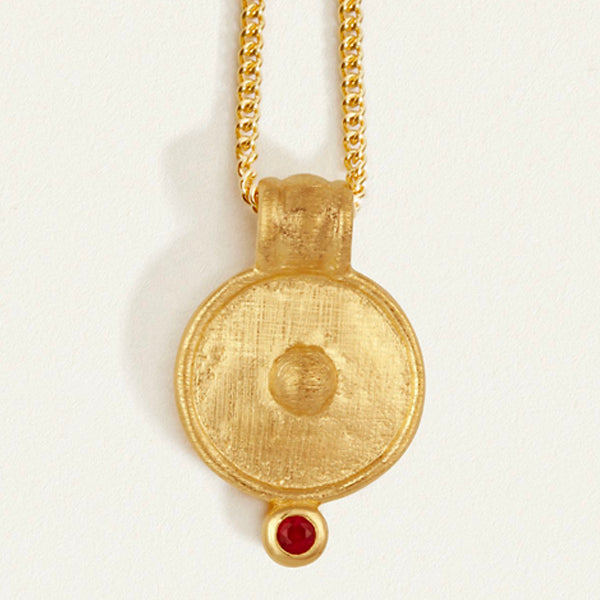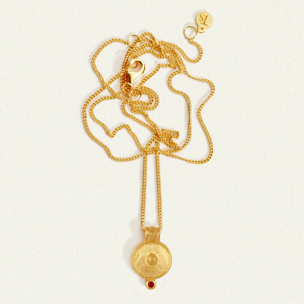 The Argos Necklace is an 18k gold vermeil pendant necklace inspired by ancient libation bowls, used for offerings to the gods or ancestors. This dainty ruby necklace features a round pendant suspended from a fine curb chain.