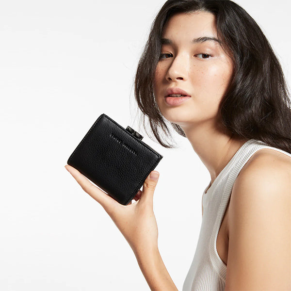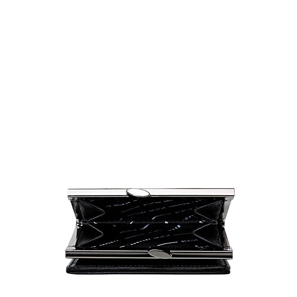 Likely to bring you to a point of attention, this little clasp purse has it going on in its compact form. Expanding coin compartment, full size bank note space and 6 card slots. As you were.