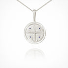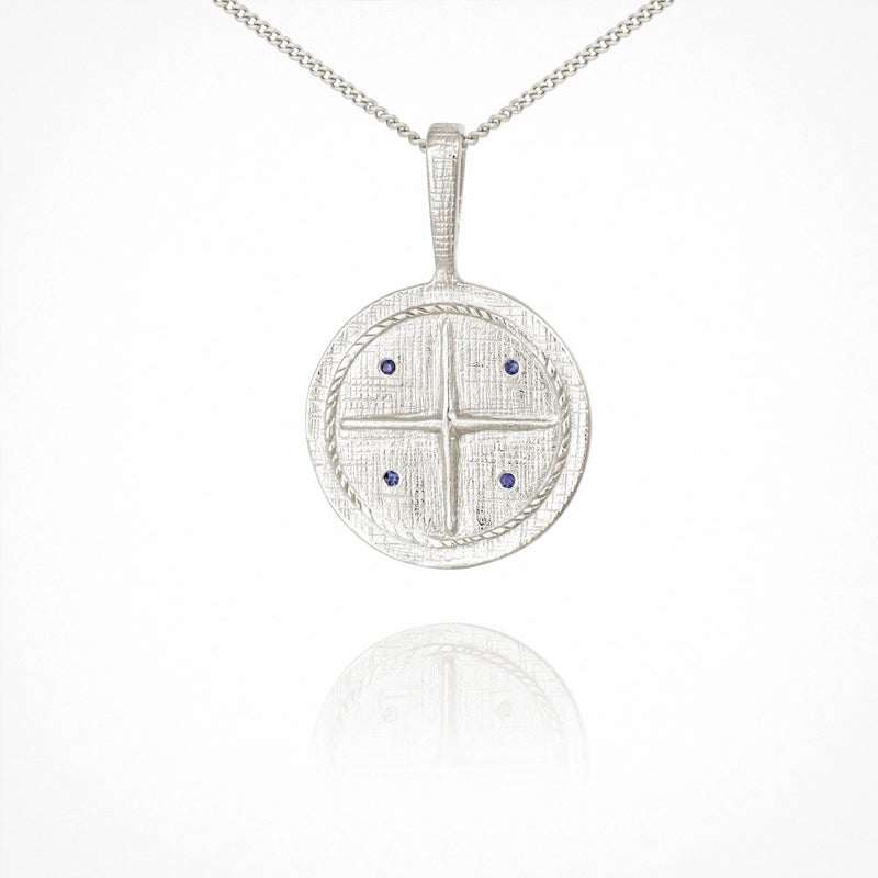 The cross brushed coin necklace is divided into four quadrants by two intersecting lines, with a round cut Blue Sapphires sitting within each section. Sapphires speak to wisdom, intuition, and spirituality. The Atlas Necklace is a reminder to listen to and trust your own intuition, charting your own course in life.