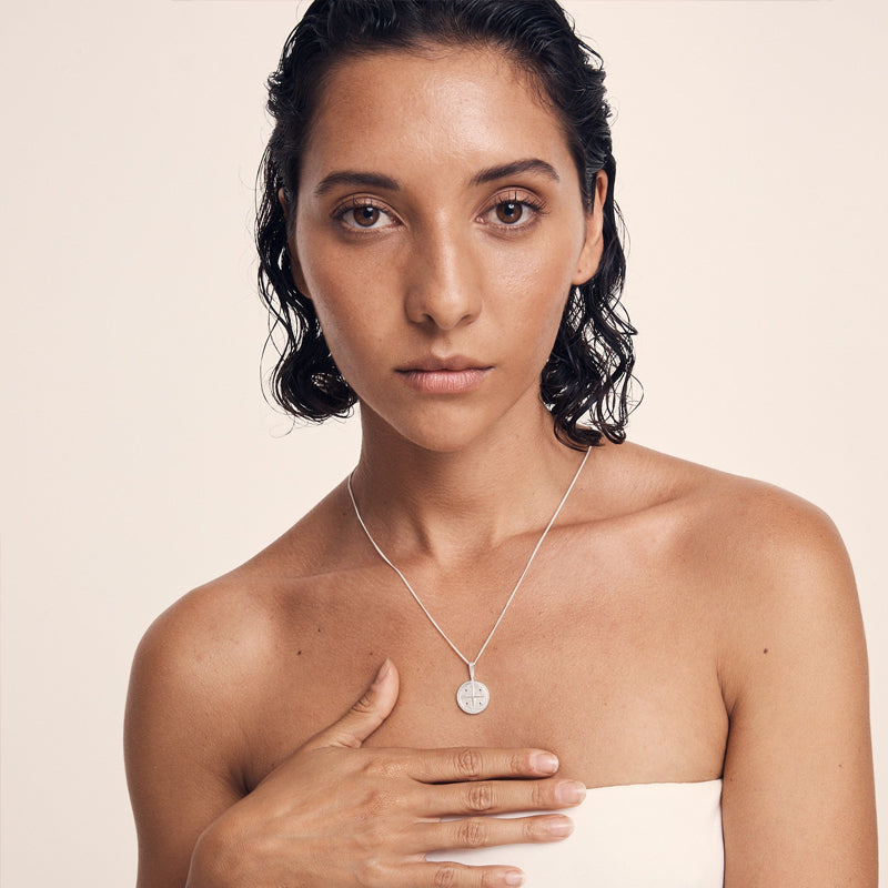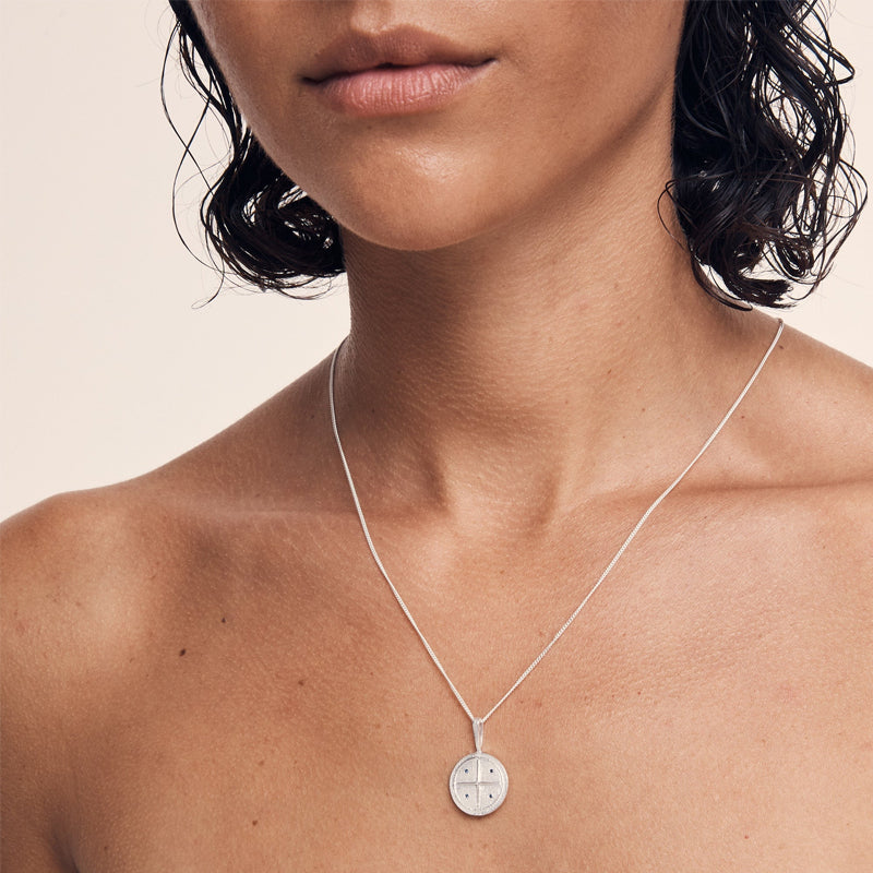 The Atlas Necklace in 925 Sterling Silver is a coin pendant that sits upon a longer chain length that layers beautifully and is a unisex style to adorn all. Named after the Greek Titan who bore the world on his shoulders, the Atlas Necklace denotes great strength and is reminiscent of a compass, evoking notions of travel and adventure.