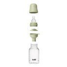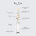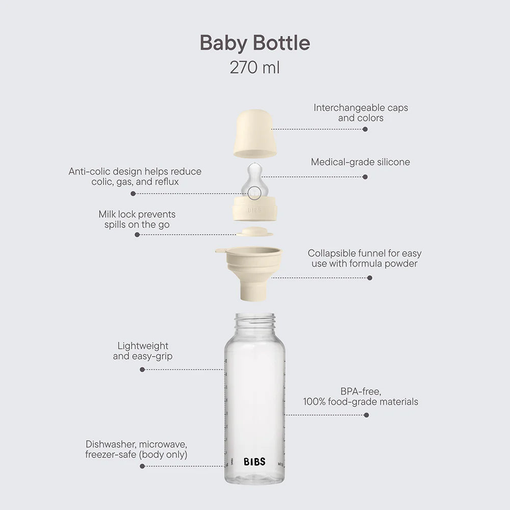The slow flow bottle nipple is natural rubber latex, the bottle is BPA-free, and all additional parts are BPA-free and 100% food-grade. Including a spill-preventing milk lock, collapsible funnel for formula powder, and measurements in standard feeding increments, this bottle set is the ideal combination of innovation and functionality.