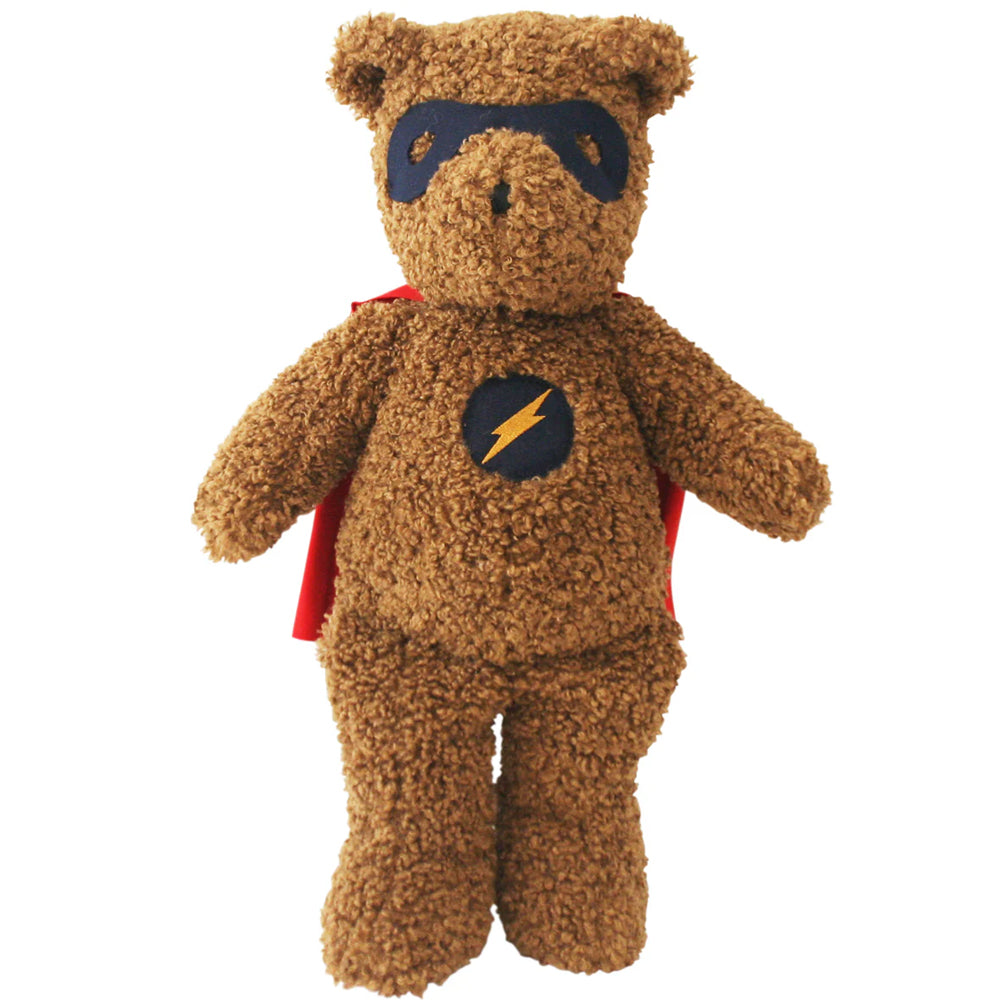 Featuring a navy mask, red cape and lightening bolt logo on his chest, he's the sweetest, softest superhero going round.