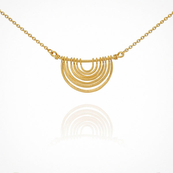 A fine looped chain meets in the middle of the Baye Necklace to hold seven soft golden hand brushed differing semicircles that sit symmetrically and chime together. A delicate piece to layer with or sit daintily on its own.