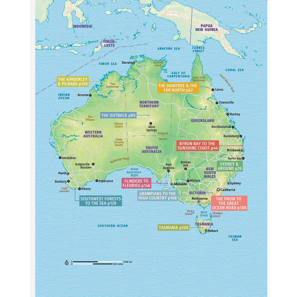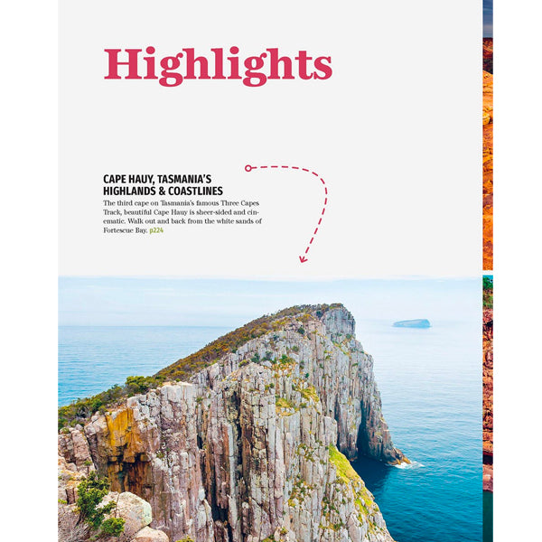 Sydney & Around, Byron Bay to the Sunshine Coast, The Daintree & the Far North, the Outback, The Kimberley & Pilbara, Southwest Forests to the Sea, Flinders to Fleurieu, Grampians to the High Country, the Prom to the Great Ocean Road, and Tasmania - Essential info at your fingertips - walk itineraries accompanied by illustrative maps are combined with details about walk duration, distance, terrain, start/end locations and difficulty (classified as easy, easy-moderate, moderate, moderate-hard, or hard)