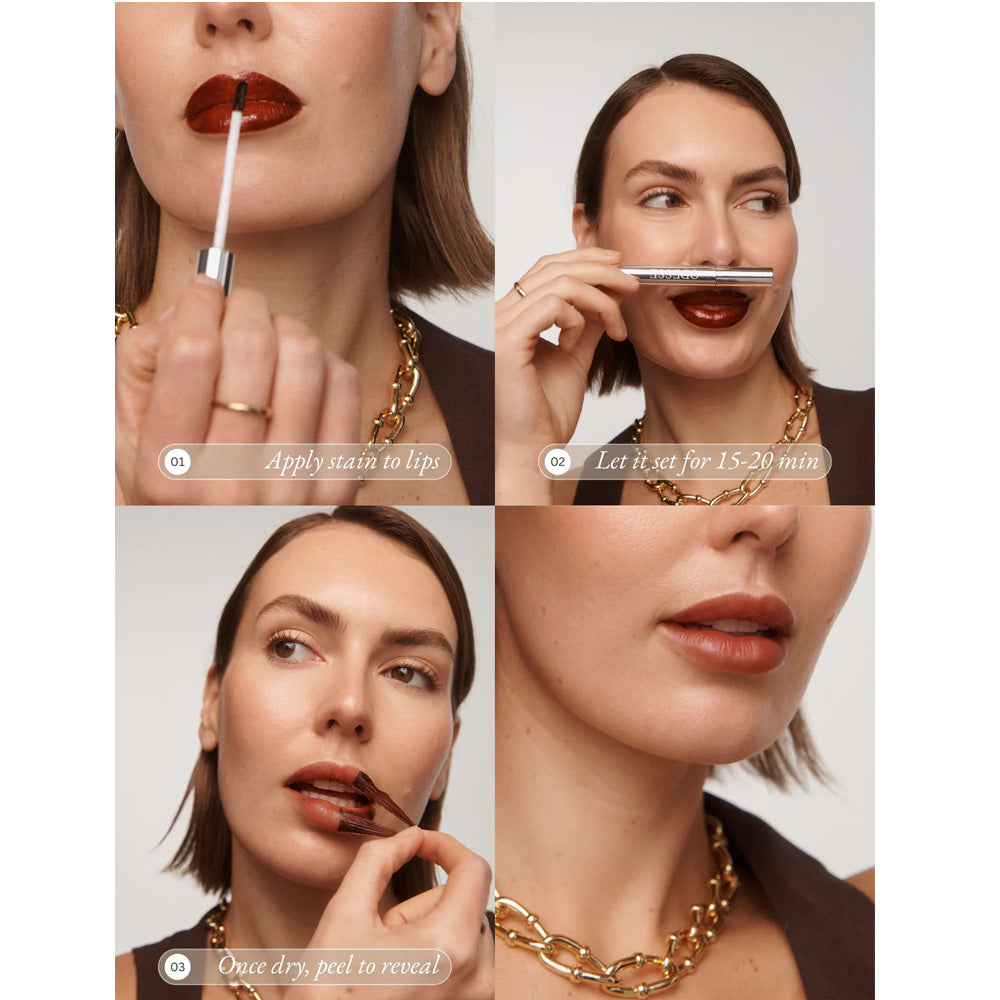 To use, simply start with clean, product-free lips. Apply the stain to lip line or entire lips. Let it set for 15-20mins, or til fully dry. Once dry, peel off the film to reveal the stain. Done! Wear as is, or finish with your favourite balm or gloss to hydrate and enhance the stain.