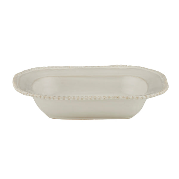 This Bistrot Ceramic Bowl makes for a sweet serving dish. Its oval shape features a flattened rim for easy handling, and small beaded details for extra interest.