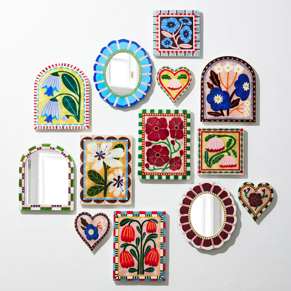 Discover Bloom Nouveau: a premium wall art collection blending Art Nouveau inspiration for a joyful contemporary home aesthetic. Featuring Capiz shell tiles and mirrors, each piece showcases vibrant hand-painted florals alongside bold graphic patterns. These versatile artworks combine nature-inspired motifs with contemporary designs, creating stunning displays that elevate any space. Mix and match Bloom Nouveau's tiles and mirrors to transform your walls into a gallery of light-catching, floral elegance.