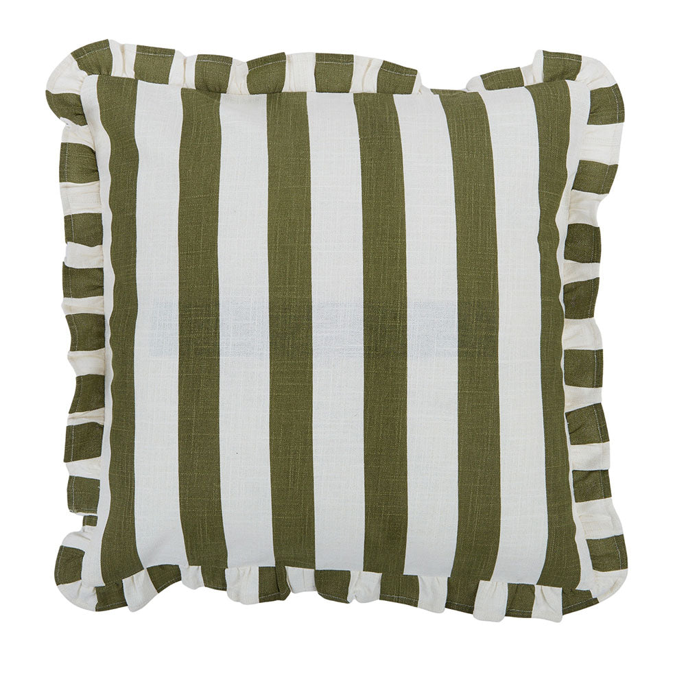 With a bold olive stripe design and a ruffled edge, the Bonny Cotton Cushion is a playful statement. Layer it with a block colour cushion, or lean in with clashing patterns for a fun look.