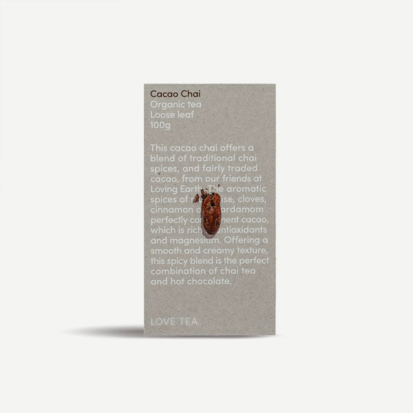 This cacao chai offers a blend of traditional chai spices and high quality black tea, blended with fairly traded cacao. The aromatic spices of star anise, cloves, cinnamon and cardamom perfectly complement cacao, which is rich in antioxidants and magnesium. Offering a smooth and creamy texture, this spicy blend is the perfect combination of chai tea and hot chocolate.