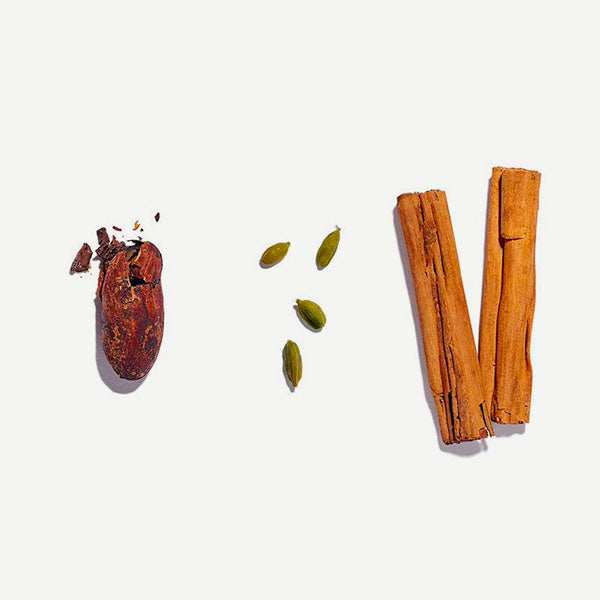 Cacao (Theobroma cacao)*, Black Tea (Camellia sinensis)*, Cinnamon (Cinnamomum Cassia), Ginger (Zingiber officinale)*, Cardamom (Elettaria Cardamomum), Turmeric (Curcuma longa), Star Anise (Illicium verum), Cloves (Syzygium aromaticum)*, Black Pepper (Piper Nigrum)*, White Pepper (Piper Nigrum)*