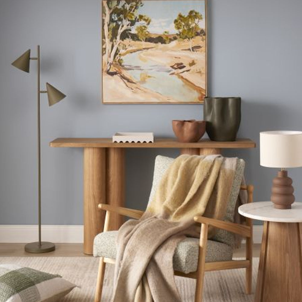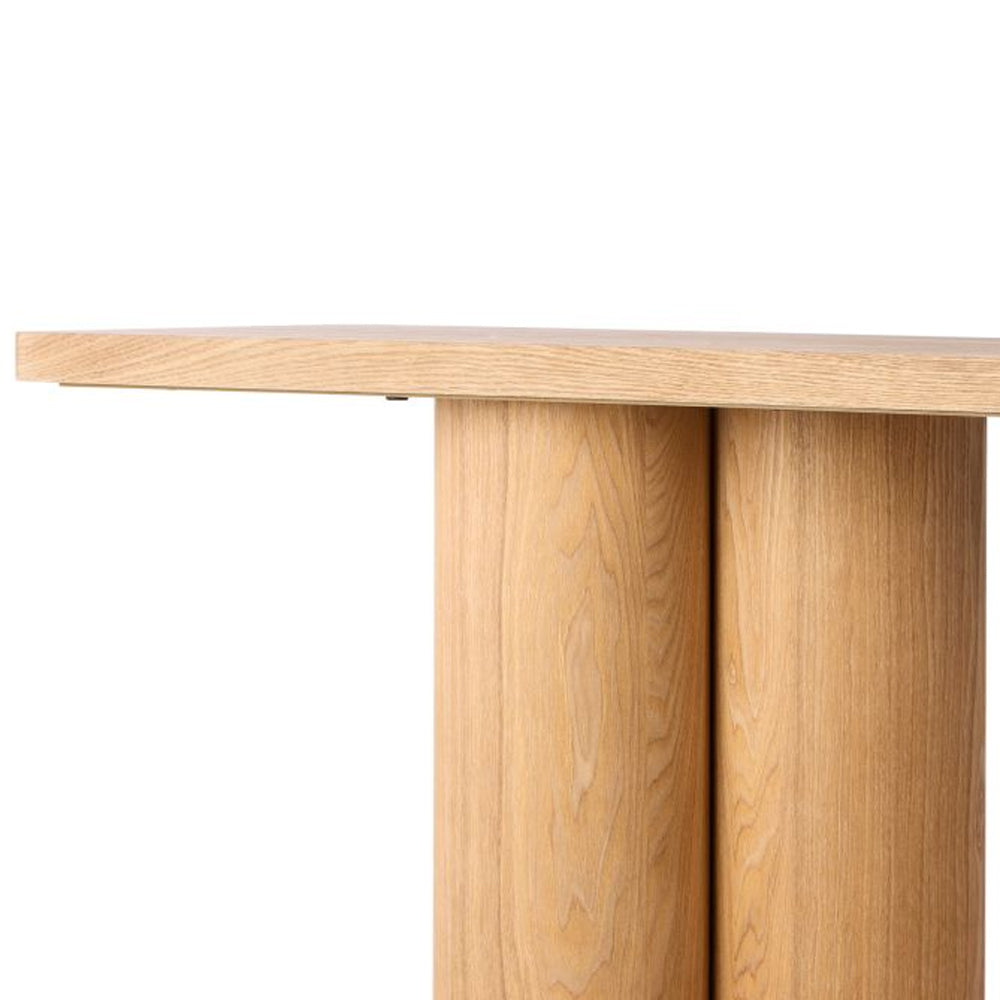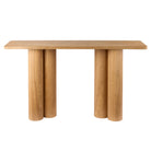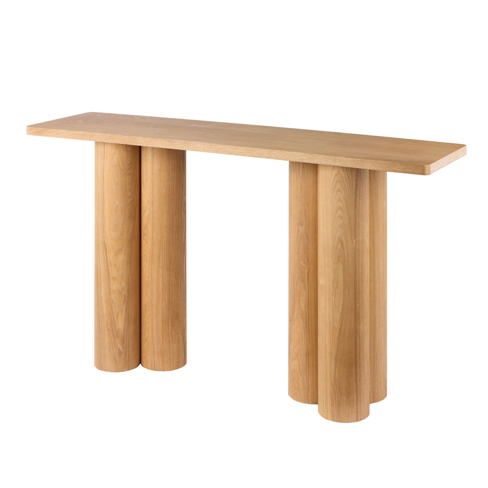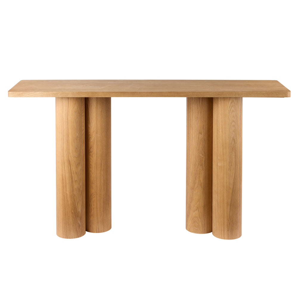 The Cade Console Table is sleek and sophisticated, with a contemporary silhouette to complement all interior styles. Crafted from wood with a natural veneer, Cade features a simple rectangular top, resting on a grouping of three cylidrical posts to form each leg.
