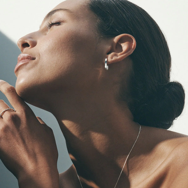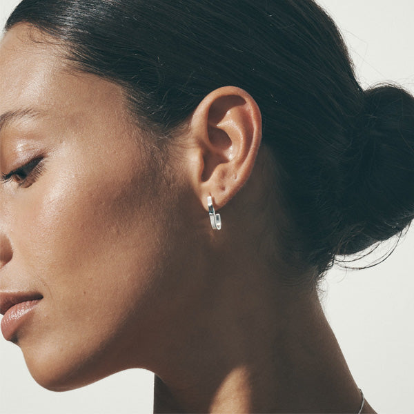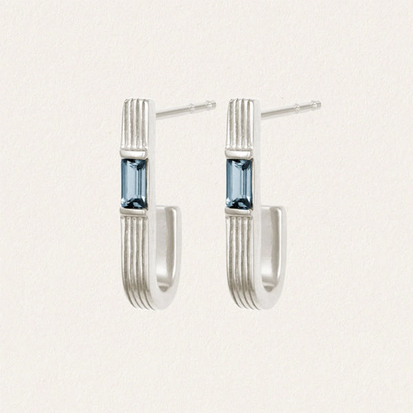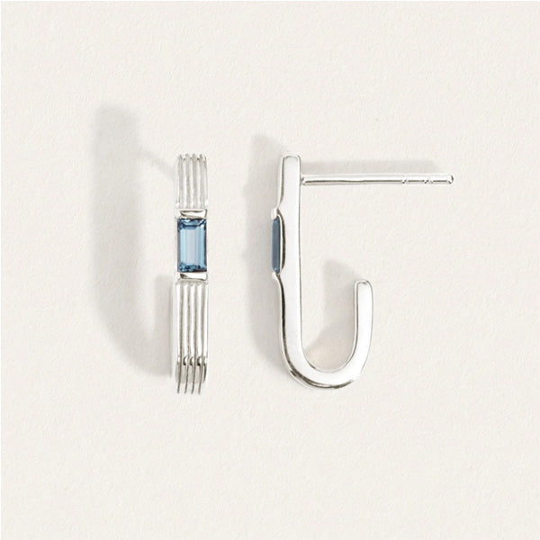 The Cala Earrings, in ethical 925 sterling silver, are a contemporary reinterpretation of the classic hoop earring. This U-hoop is small enough to be worn every day, its clean lines ideal for stacking. An open hoop design speaks to adventure: an open-ended journey full of potential. The cool tones of the London Blue Topaz baguette carry the soothing essence of the ocean.