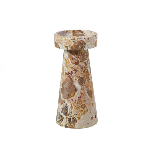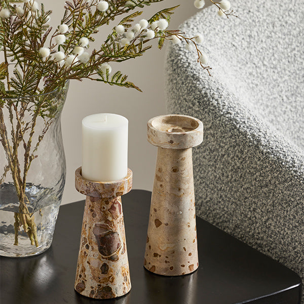 This large Carprani Candle Holder is truly a statement piece. Made from marble, it displays a stunning natural stone appearance with various earthy shades, accompanied by an elongated silhouette that tapers in at the neck.